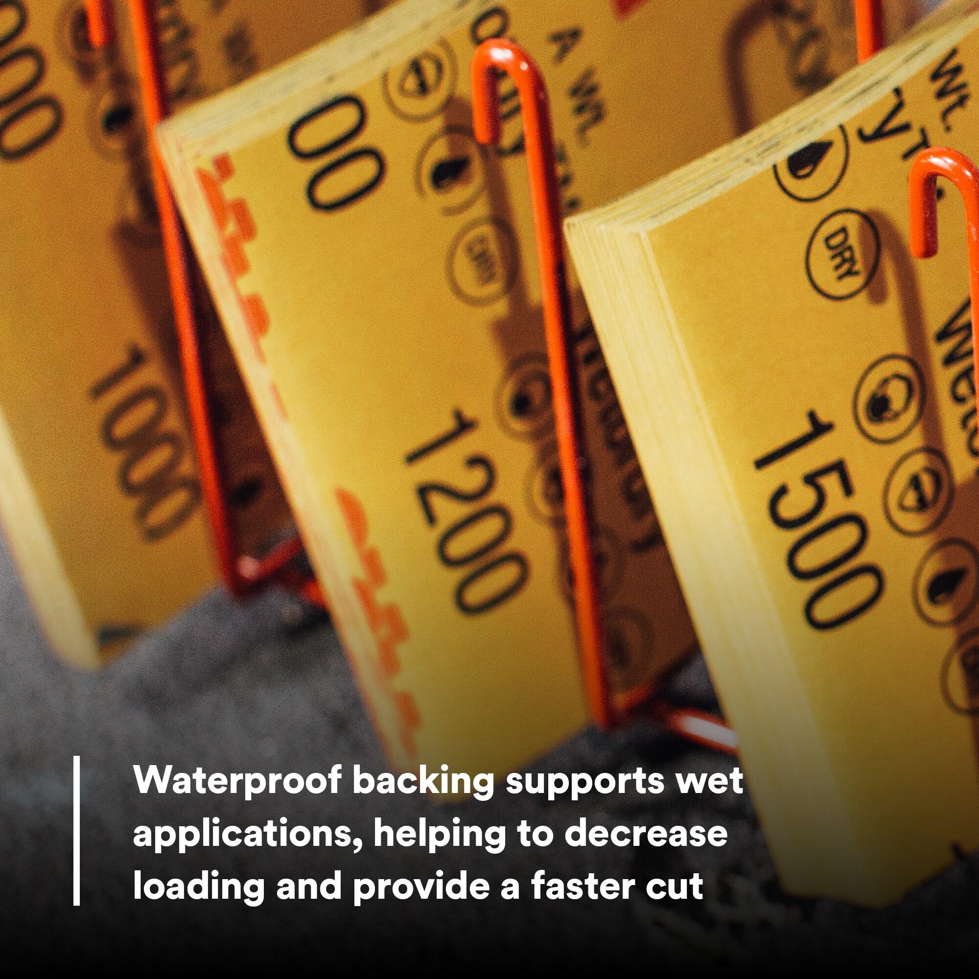Our 3M™ Wetordry™ products are backed with a durable waterproof paper backing that supports wet and dry applications. Lighter weight than cloth and smooth rather than textured, the paper backing is preferable for lighter applications such as finishing and paint prep. At the same time, many such applications produce a significant amount of dust, clogging the abrasive points and creating an inferior work environment. These effects can be minimized by sanding with water to rinse dust away.