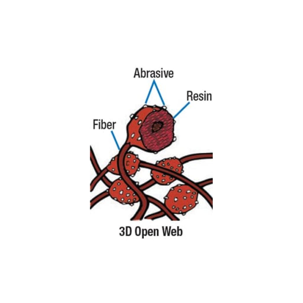 The open-web material runs cool and is load resistant, which keeps the abrasive minerals cutting at high performance by limiting clogging of the fibers. Fibers in the web continually break down with use to reveal fresh mineral for exceptional consistency, superior cut performance, and extremely long service life.