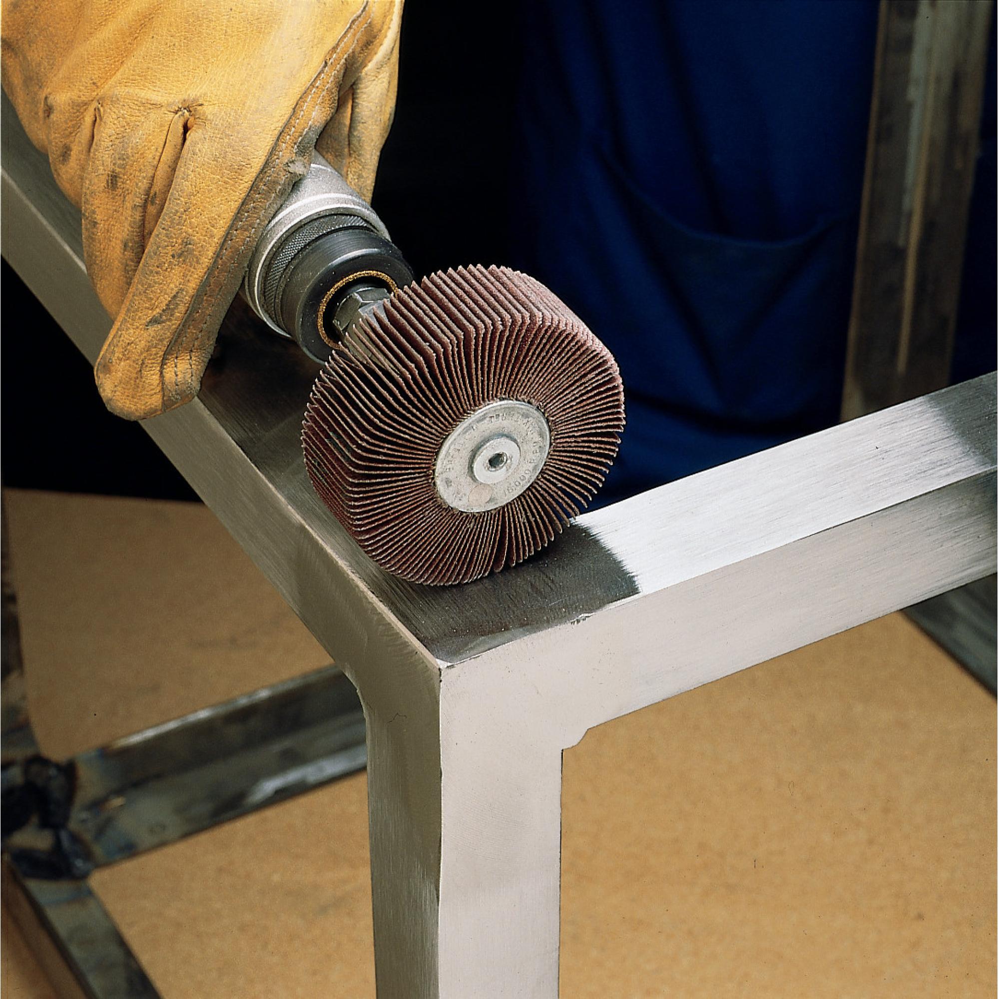 The abrasive mix is attached to a flexible cotton backing using a resin bond. This resin bonding material is specially designed to resist thermal and chemical deterioration, which can occur during high speed sanding. This bond is very hard which allows for faster cuts and a higher cut rate. This wheel also includes a grinding aid for cooler running on stainless steel. Each flap uses an X-weight cotton backing, which provides a tough, but flexible surface that bends to fit any work piece. As the wheel is used, the self-cutting flaps wear away to expose sharp, new abrasive material, assuring that surfaces are sanded consistently throughout the life of the wheel.