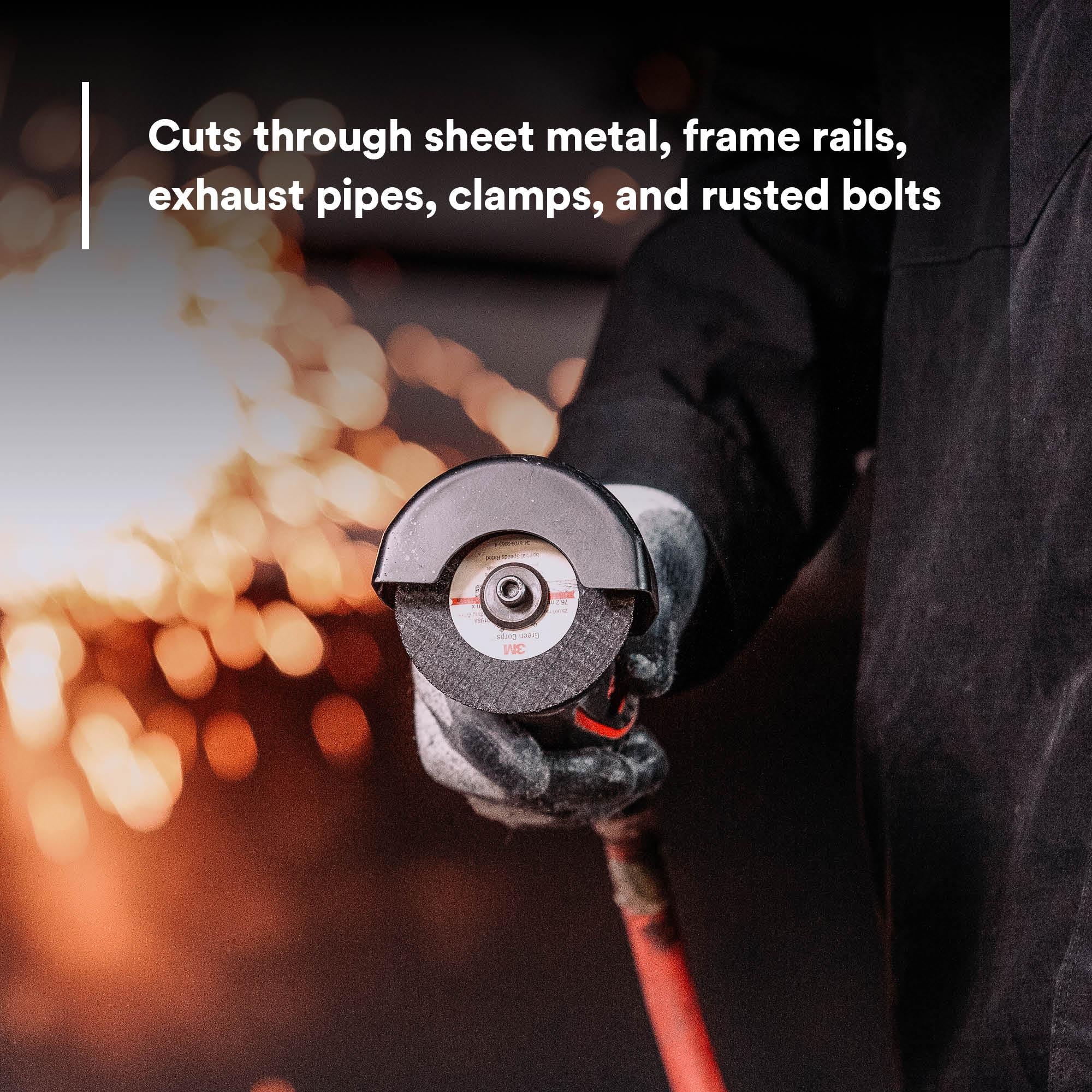 3M General Purpose Cut-off Wheel is a durable, fast-cutting wheel useful for cutting autobody sheet metal, frame rails, exhaust pipes, clamps, and rusted bolts. Aluminum oxide grains are bonded together into a rigid wheel that cuts fast and can be used again and again. Designed for use on utility type cut-off tools. DO NOT USE TOOLS WITHOUT GUARDS.Cut-off wheels must be attached to a cut-off wheel power tool designed specifically for the size of wheel used. For safety, cut-off wheels must always be used with a wheel guard that is compatible with the size of the wheel. The cut-off wheel must have a maximum operating speed greater than or equal to the maximum speed of the power tool used. Our General Purpose Cut-Off wheels are easily changed with a hub and retainer nut design when discs become worn.