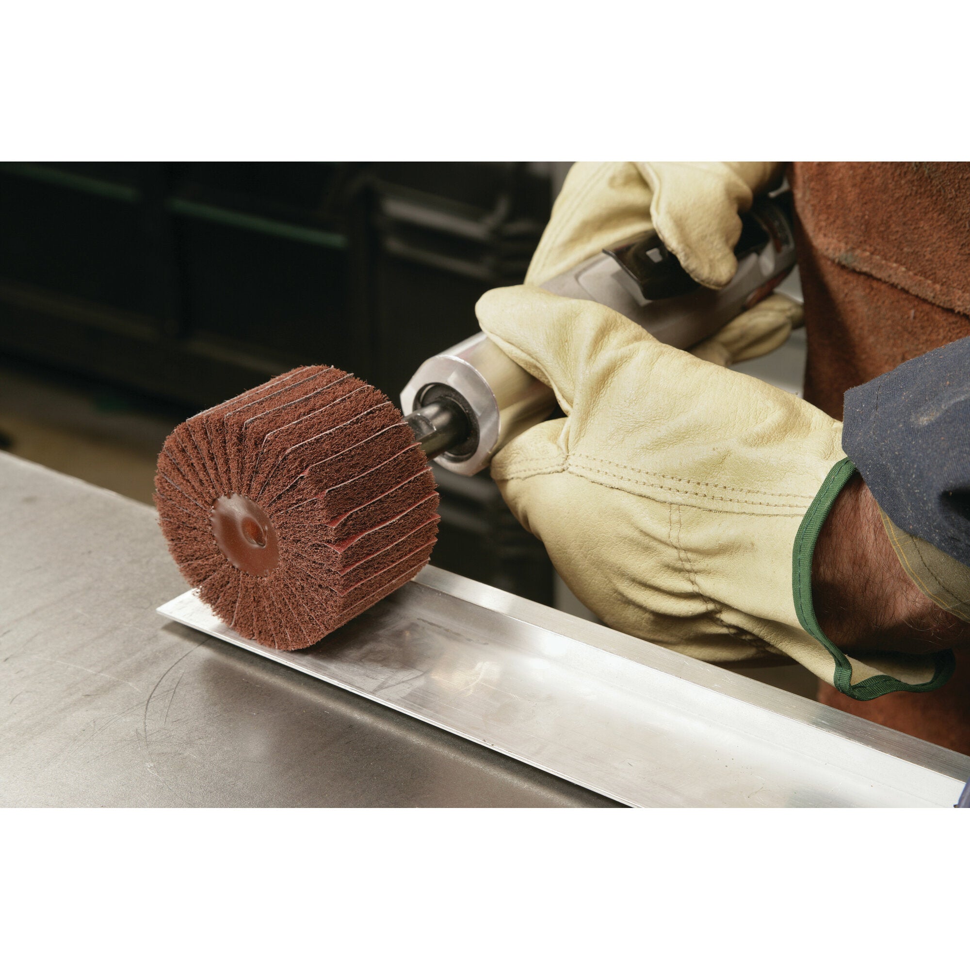 Scotch-Brite Combi-S Wheel is a unique finishing wheel composed of alternating Scotch-Brite non-woven flaps and aluminum oxide coated abrasive sheet. Conformable pads provide a large footprint and cushion the abrasive sheets to create a brushed, decorative finish.This wheel is mounted on a 1/4" spindle that supports the wheel for stability and reduces side-loading, helping it remain perpendicular to the work surface.