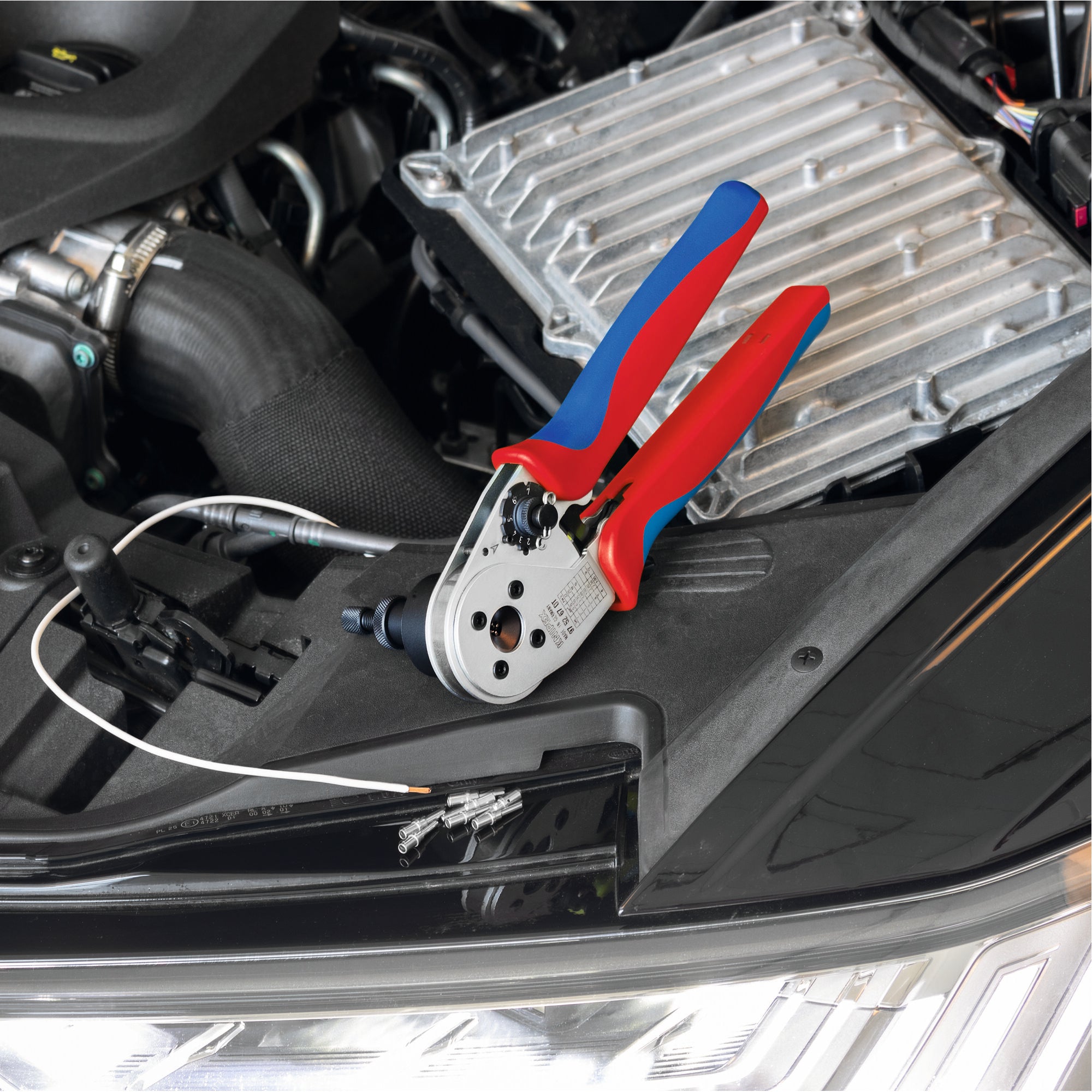 Crimps all turned male and female contacts of the DT, DTM and DTP series (DEUTSCH series). Crimping capacity from 22-12 AWG (0.35 mm²-3.0 mm²). Synchronous feed of the four mandrels achieves optimum crimping results with eight indentations (4/8-Indent). Position settings for the crimp depth can be clearly read on the pliers. Crimp depth selector wheel with eight locking positions for the perfect crimp. Universal positioning locator for flexible adjustment to all contact lengths. Repetitive, high crimping quality due to ratchet mechanism (unlockable). Low manual force required due to lever transmission. Comfortable multi-component grips. Go/No-Go gauges allow quick quality calibration control at any time. Go gauge must fit, No-Go gauge must not fit. Gauges (97 59 67 1 and 97 59 67 2) are sold separately.