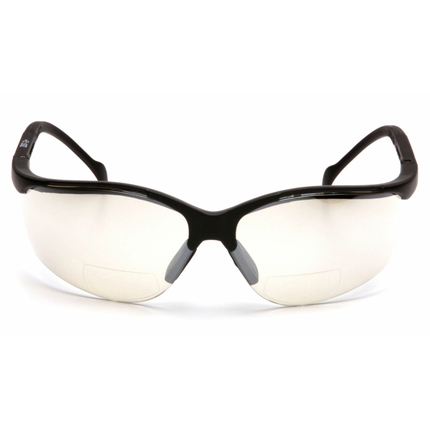 Pyramex - V2 Readers - Black Frame/Indoor/Outdoor Mirror + 1.5 Lens - 9.75 Base curved lens provides full side protection without distracting seams or traditional type side shields. Nose buds secure the glass and prevent slipping while providing a pillow soft fit. Fully adjustable temples - 4 size settings. Lenses provide 99% protection against harmful UV rays. Lenses are coated for superior scratch resistance. Strategic placement of lens insert is out of user's direct line of vision.