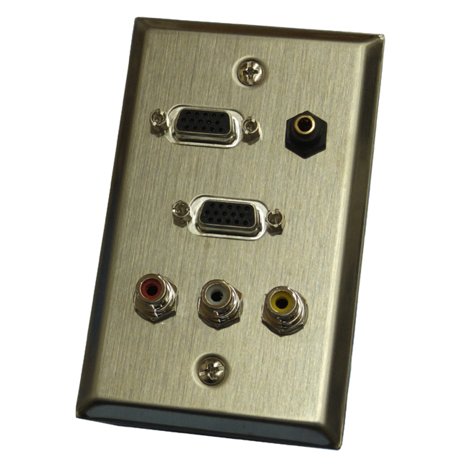- (2) VGA (HD15) + 3.5mm stereo + 3 RCA AV feed-thru jacks (red/white/yellow)