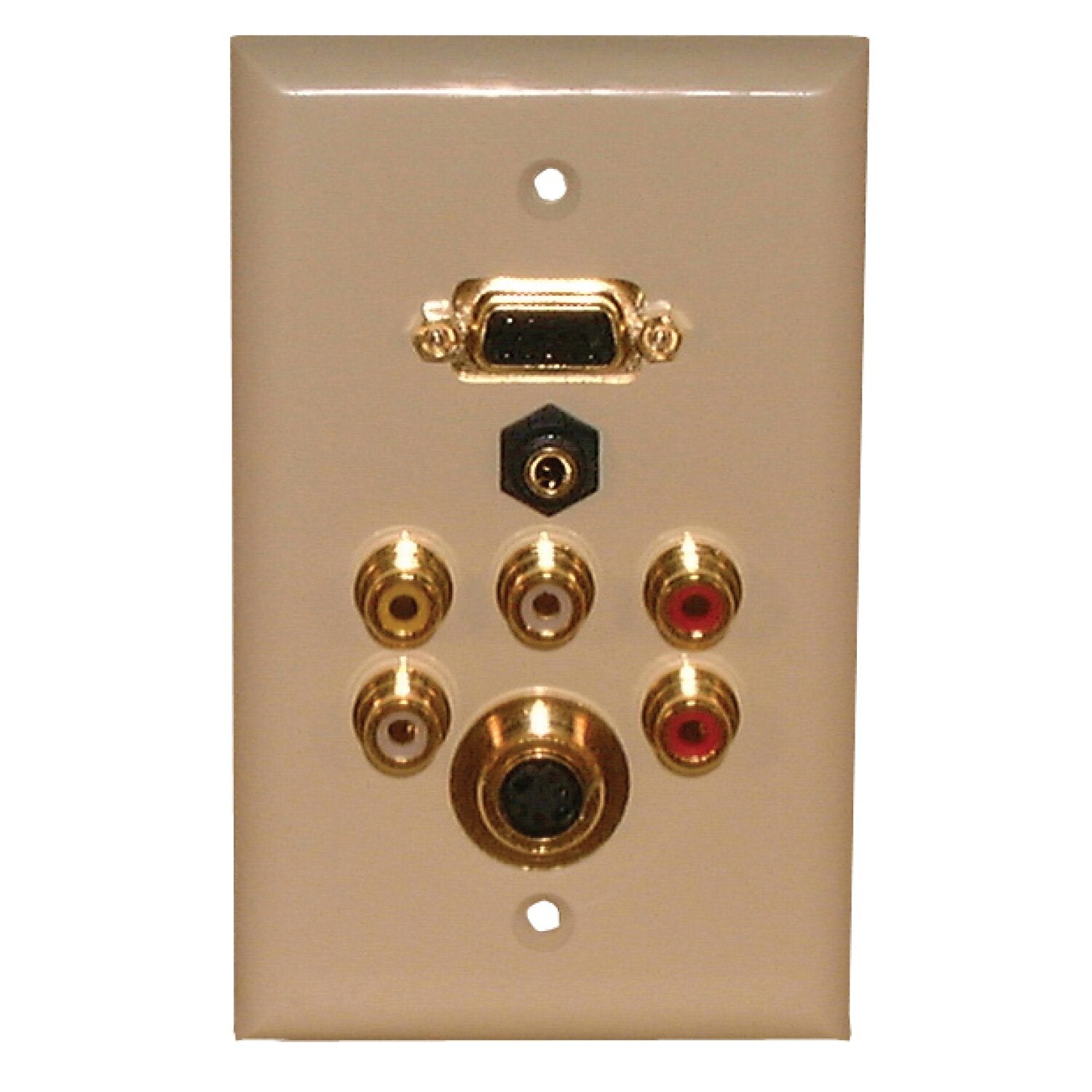 Enhance your multimedia connectivity with the VGA Plus VGA + 3.5mm stereo + audio/video (red, white, yellow) + audio (red/white) + S-VHS Wall Plate. This versatile wall plate accommodates various audio and video inputs, ensuring seamless integration for home theaters, conference rooms, or educational settings, delivering superior connectivity and convenience.