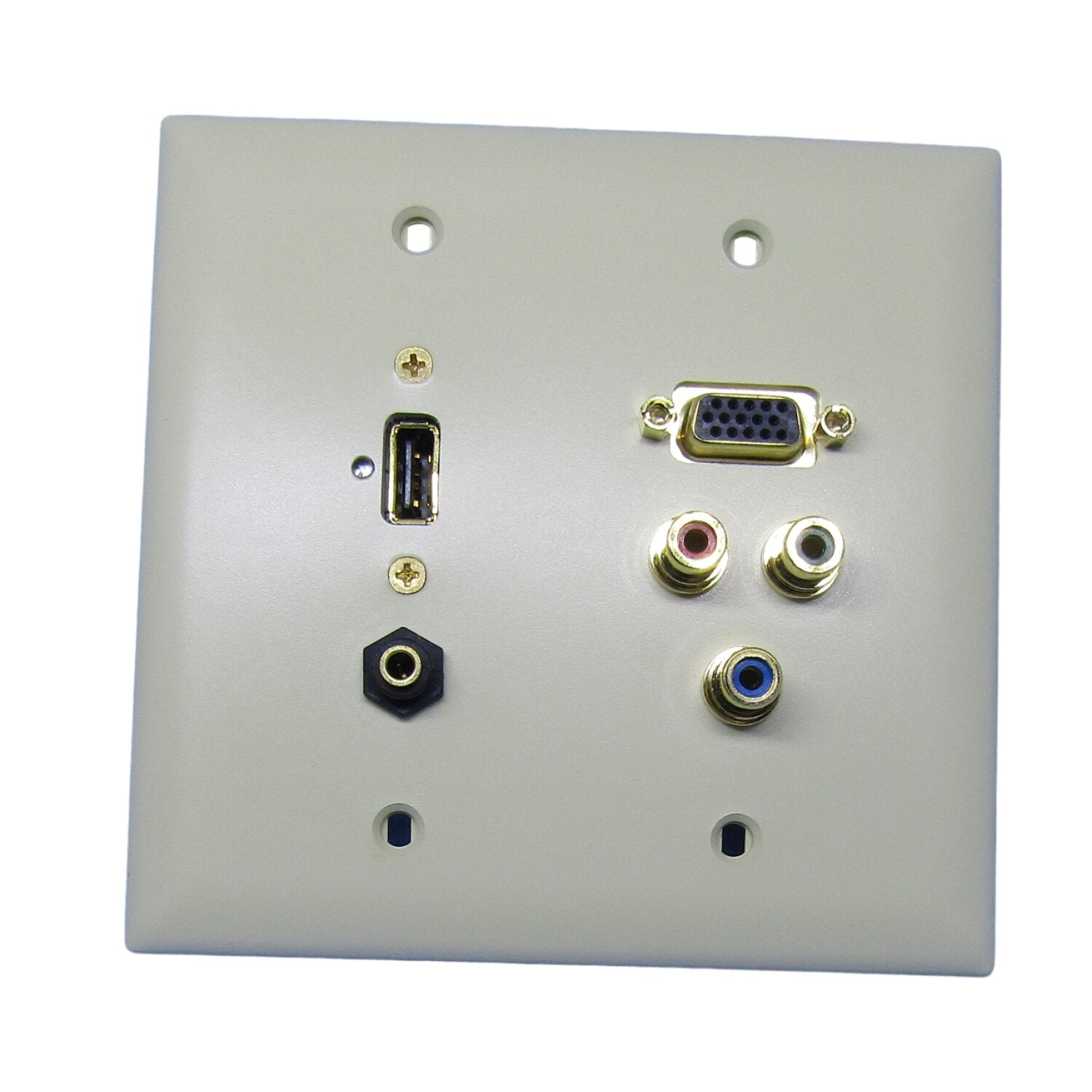 Integrates multiple connectivity options into a single wall-mounted unit. Ideal for multimedia setups, it combines VGA ports for video, 3.5mm stereo for audio, three RCA component video inputs, and a USB A port for versatile connectivity in educational, corporate, or home entertainment environments.