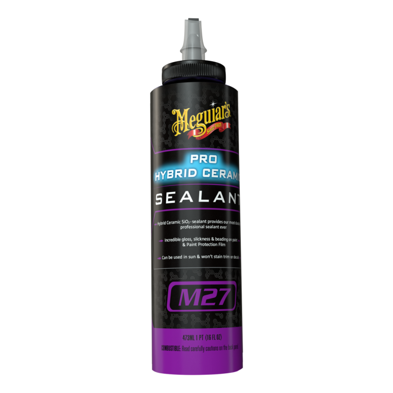 Meguiar's M27 Hybrid Ceramic Sealant is an advanced formulation uniquely tailored to deliver a professional strength liquid sealant that offers the best Hybrid Ceramic technology available. With a true Si02 foundation, this ceramic hybrid sealant is formulated to deliver outstanding durability in an extremely easy to use format. It can be applied by hand or by dual action polisher like a sealant, but it allows for longer curing time before wiping off so it can be applied to the entire vehicle before removing. This all-new formula was engineered from the ground up, delivering a brilliant gloss and slickness and can be applied as an extremely durable stand-alone sealant or applied over another wax, sealant or Paint Protection Film for additional protection. Not only is it very easy to use and wipe off, but it’s also safe on plastic trim & decals without leaving behind any stains or white residue. Meguiar's M27 Hybrid Ceramic Sealant is available in 16 ounce and 1 gallon sizes.