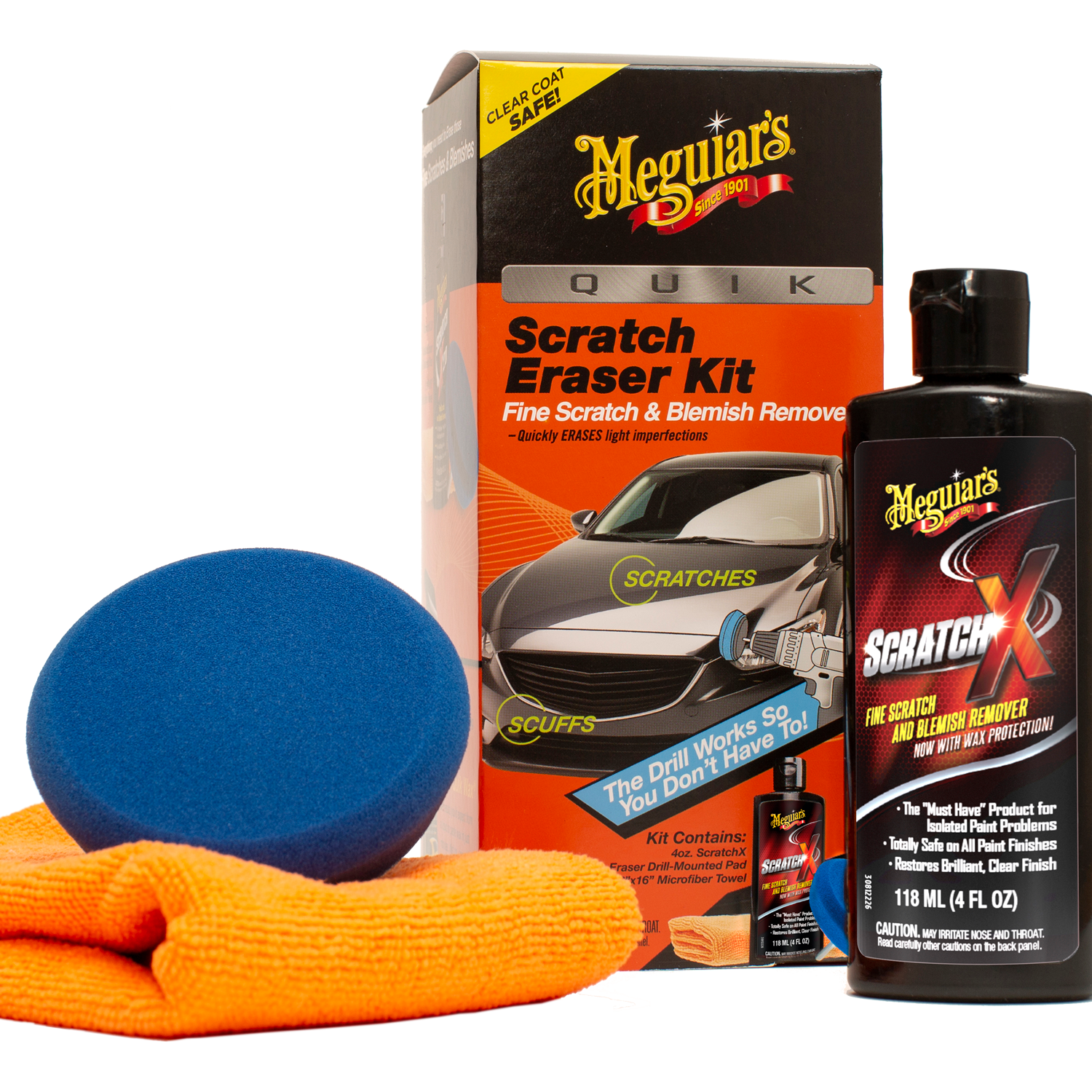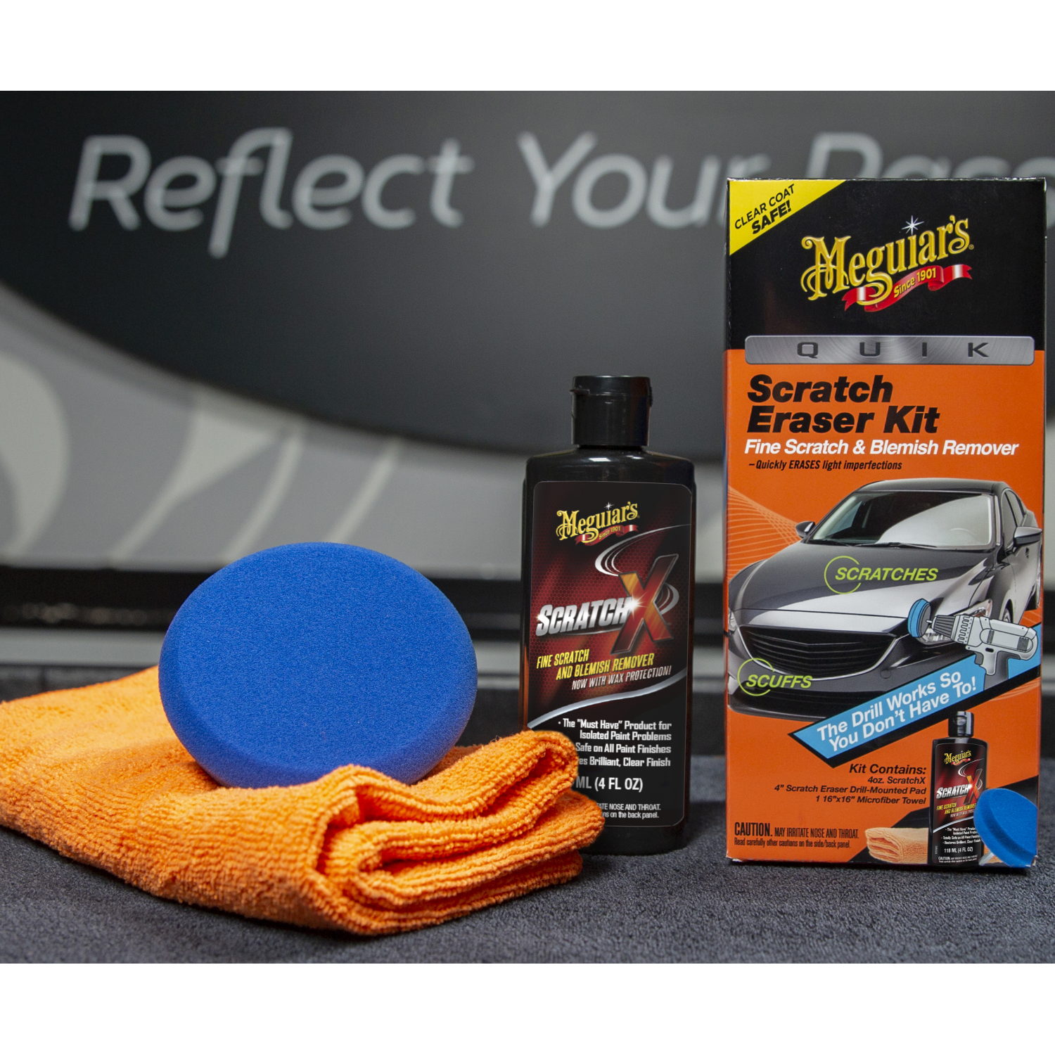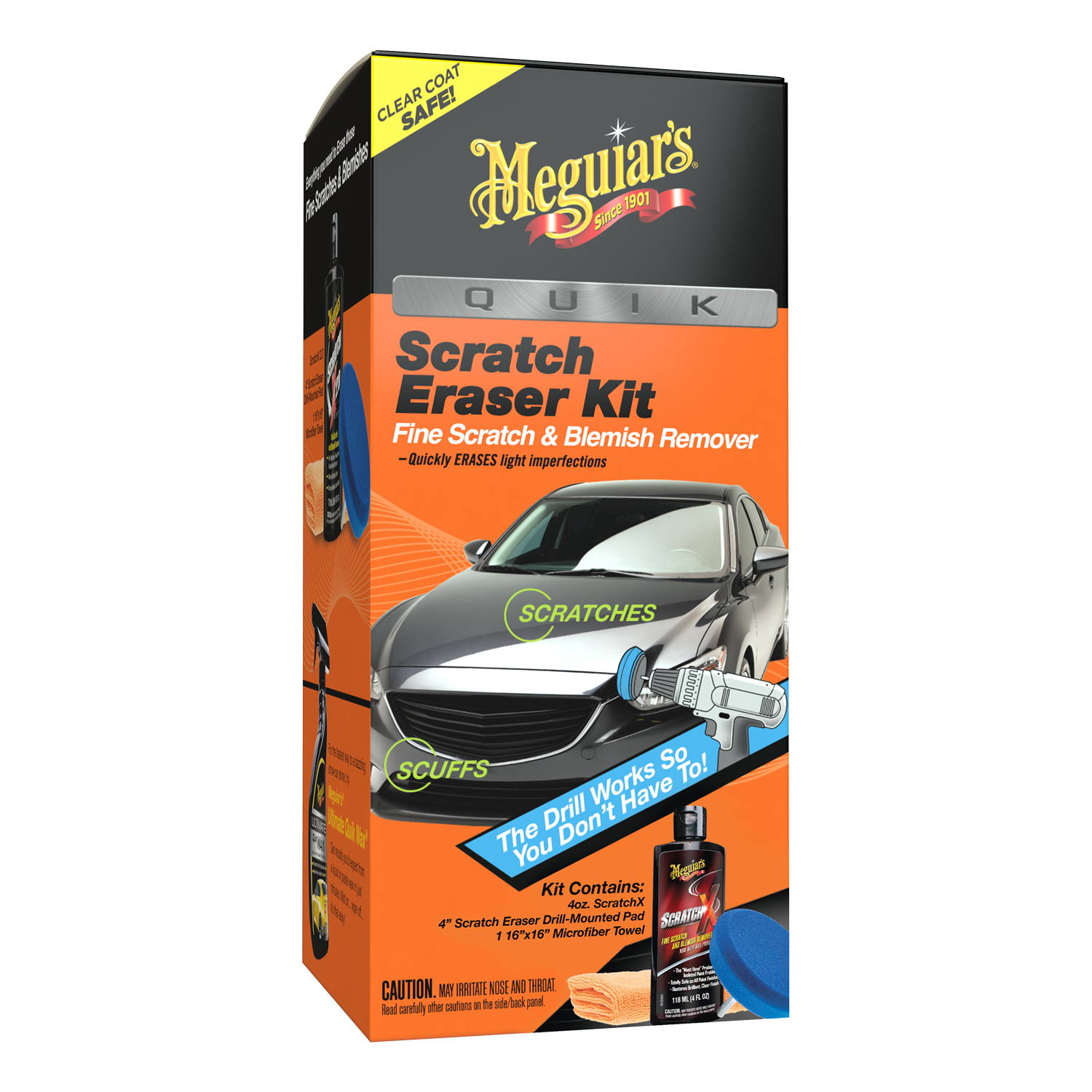 If you have light scratches and scuffs but don’t want to work by hand, there’s now a great solution with Meguiar’s Quik Scratch Eraser Kit. This kit includes everything you need to remove light imperfections quickly and easily. The kit comes with Meguiar’s proprietary 4” Scratch Eraser Pad that attaches to a standard household drill greatly reducing the time and effort it takes to remove light defects when used with Meguiar’s ScratchX, also included in the kit. Meguiar’s ScratchX contains microscopic abrasives to quickly and safely erase blemishes like light scratches, scuff marks, paint transfer, fingernail marks around door handles, light defects and more! The last component in the kit is a premium microfiber towel to safely and gently remove the ScratchX and bring up a brilliant shine. So, if you have fine scratches and blemishes let the drill do the work and erase them with Meguiar’s Quik Scratch Eraser Kit!