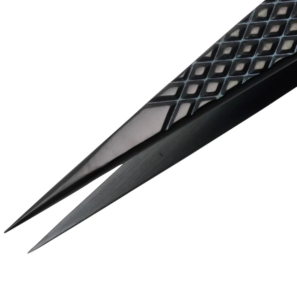 EZ Grip black tweezers are crafted from anti-acid and andt-magnetic stainless steel, and are treated with a Titanium Carbide Physical Vapor Deposition process that enhances corrision resistance.