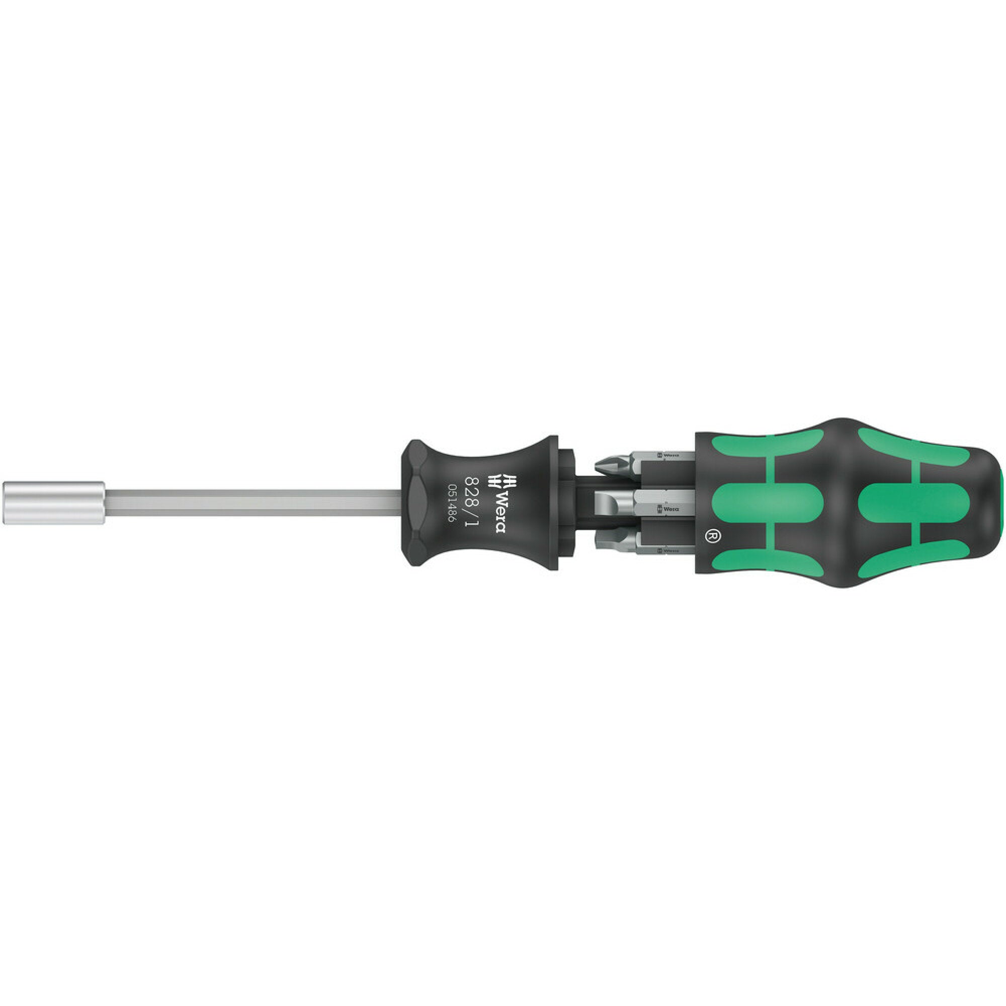 Wera compact tool with multi-component Kraftform handle for high working speeds and particularly ergonomic screwdriving. Bit magazine integrated in the handle, 6 tough bits for universal use. Bit holder with strong permanent magnet for secure seating of the bit.