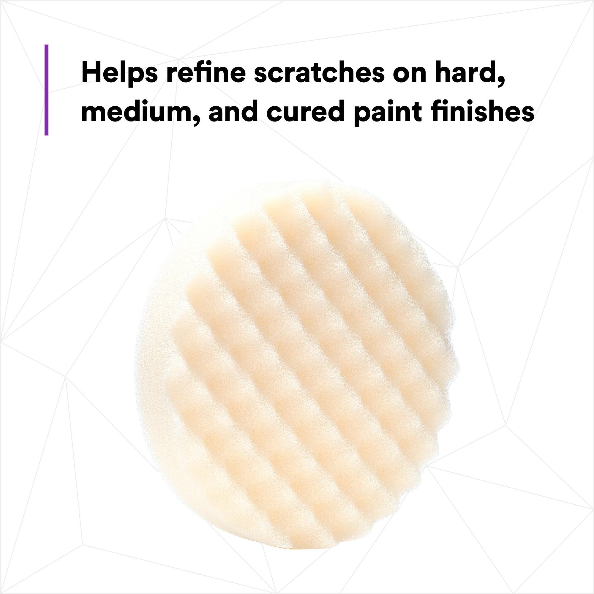 The 3M Perfect-It Foam Compounding Pads are 3M's highest-performing foam compounding pads for refining sand scratches, slow-speed polishing, denibbing and more. Foam face pattern provides more surface contact, holds compound better and reduces slinging. Doubled-sided pads work with 3M Quick Connect Adaptors on rotary polishers; double-side pads work with the Hookit system for easy change-outs.For the highest performance at every step during auto body compounding, our 3M™ Perfect-It™ Foam Compounding Pads combine features that save time and improve results – for each job, and in your auto body operation. Pad face patterns are designed into the foam to hold more compound and limit slinging, as well as provide more contact with the surface for maximum efficiency. Double- and single-sided constructions work with our Quick Connect and Hookit™ attachment systems to save time and preserve pad life. Choose a 3-, 6- or 8-inch diameter pad for a variety of specific applications including working with cured, hard or medium finish paint, denibbing, scratch removal and refining P1200 or finer sand scratches even in confined spaces.