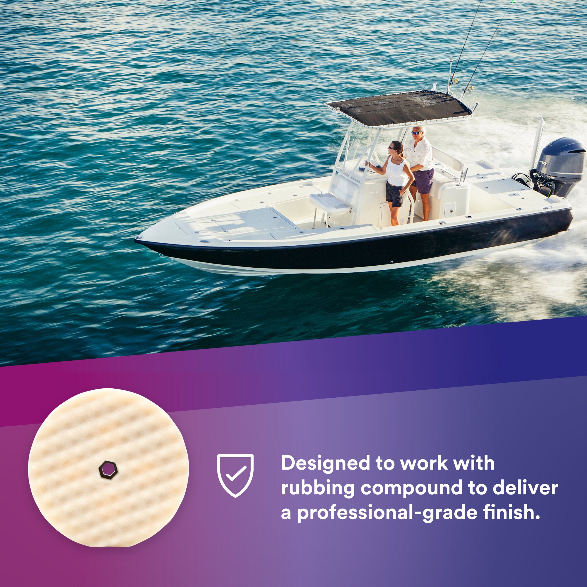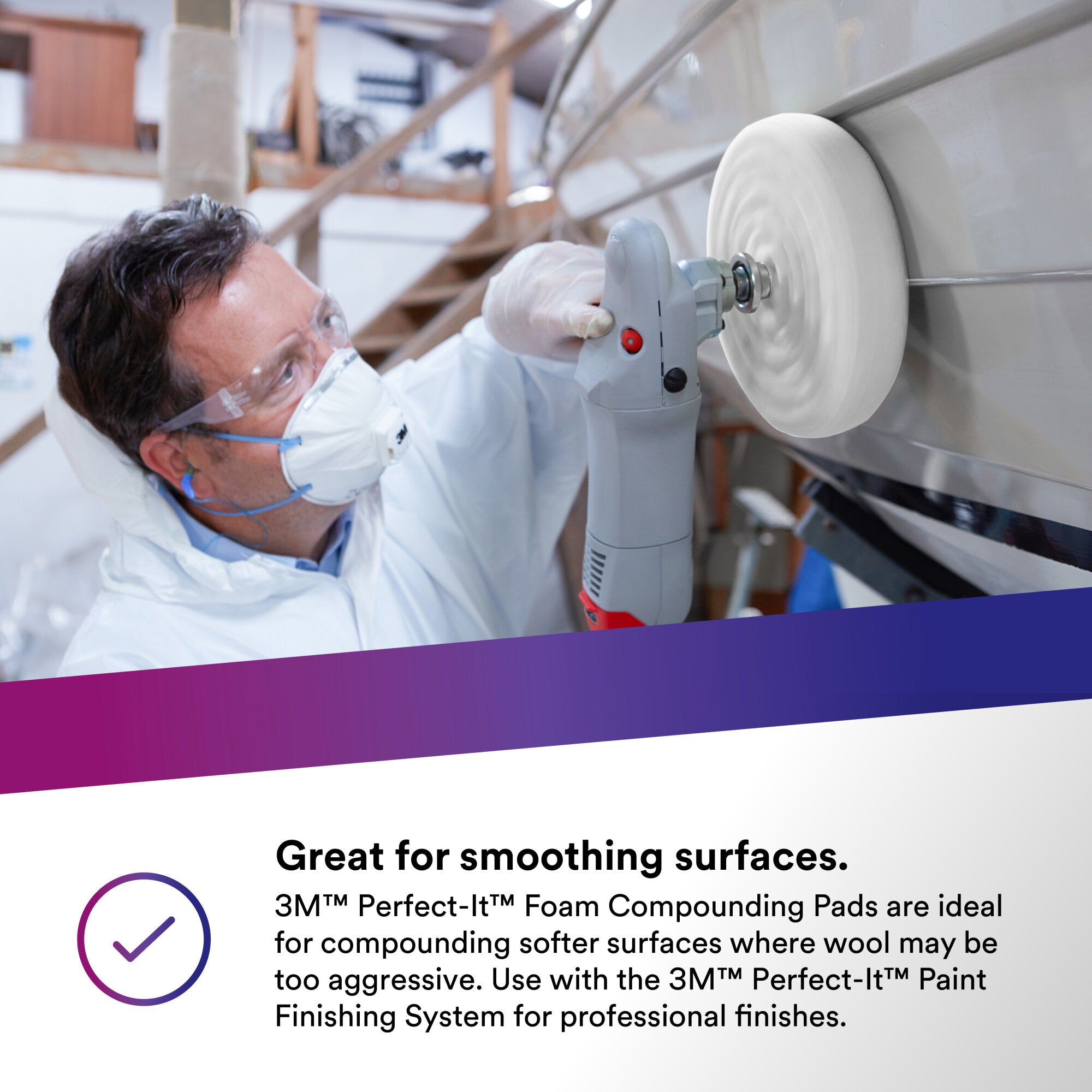 The 3M Perfect-It Foam Compounding Pads are 3M's highest-performing foam compounding pads for refining sand scratches, slow-speed polishing, denibbing and more. Foam face pattern provides more surface contact, holds compound better and reduces slinging. Doubled-sided pads work with 3M Quick Connect Adaptors on rotary polishers; double-side pads work with the Hookit system for easy change-outs.