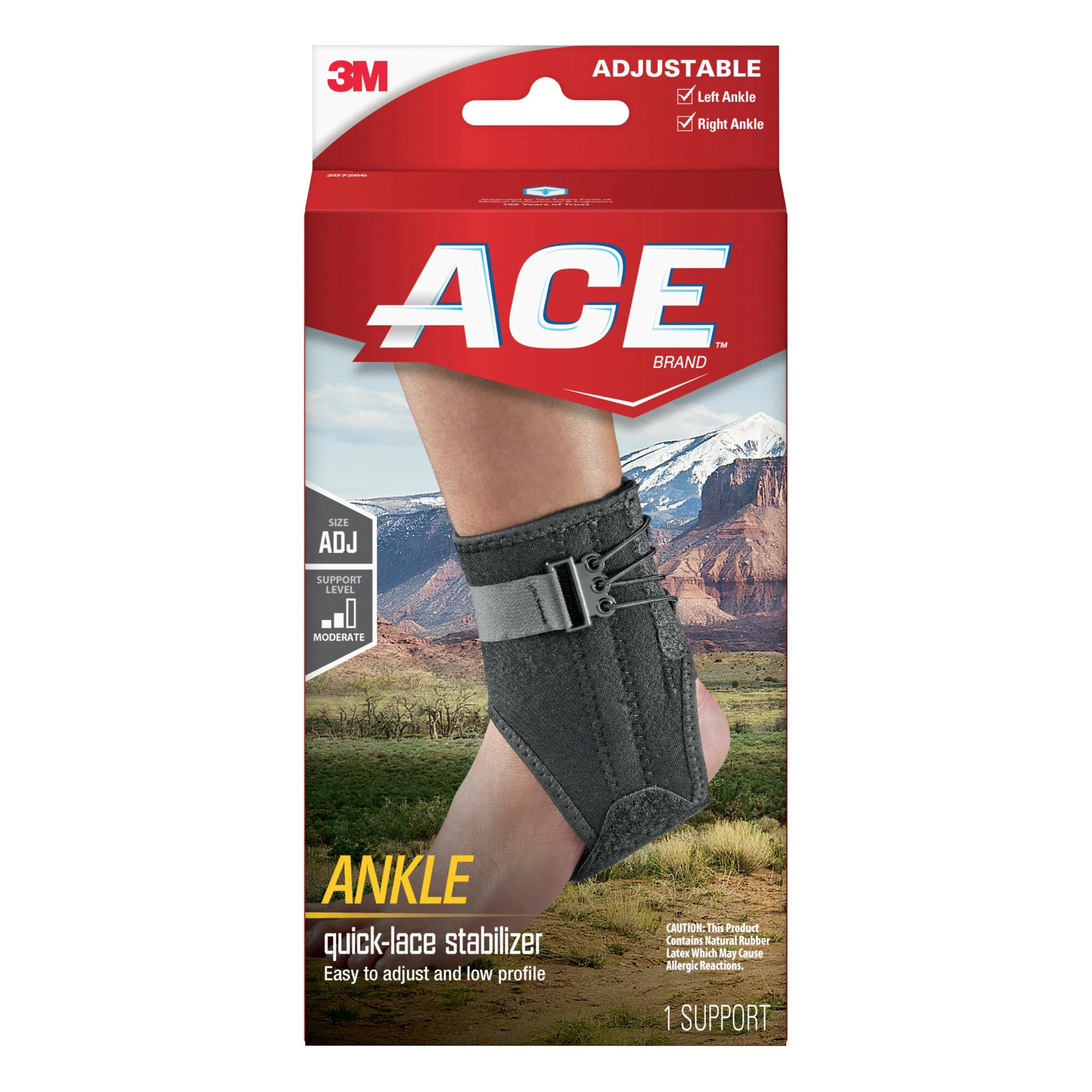Your ankle gives a solid performance every day, whether you are walking, running, jumping or swimming. Keep it strong with the ACE Ankle Brace with Side Stabilizers. Experience optimal support and compression combined with a proper fit for a triumphant return to activity.Do the activities you love with the help of our ACE™ Brand Ankle Brace with Side Stabilizers. Equipped with adjustable features, our ankle brace provides a comfortable, personalized fit. Extra support at the sides of your ankle help reduce your side to side motion for a stabilizing feel wherever you go. So whether you're nursing a recent injury, or just need a little extra support, rely on the ACE™ Brand Ankle Brace with Side Stabilizers.