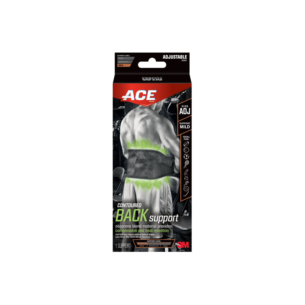 The Contoured Back Support provides soothing warmth and support to the lower back.Get your lower back ready for game time with the compression and soothing warmth of the ACE™ Contoured Back Support. Constructed with compressive neoprene blend material, this back support provides compression. A contoured fit and terry lining combine to provide maximum support and plush comfort on the field, court or track. Celebrate a win with your team–with the ACE™ Contoured Back Support.