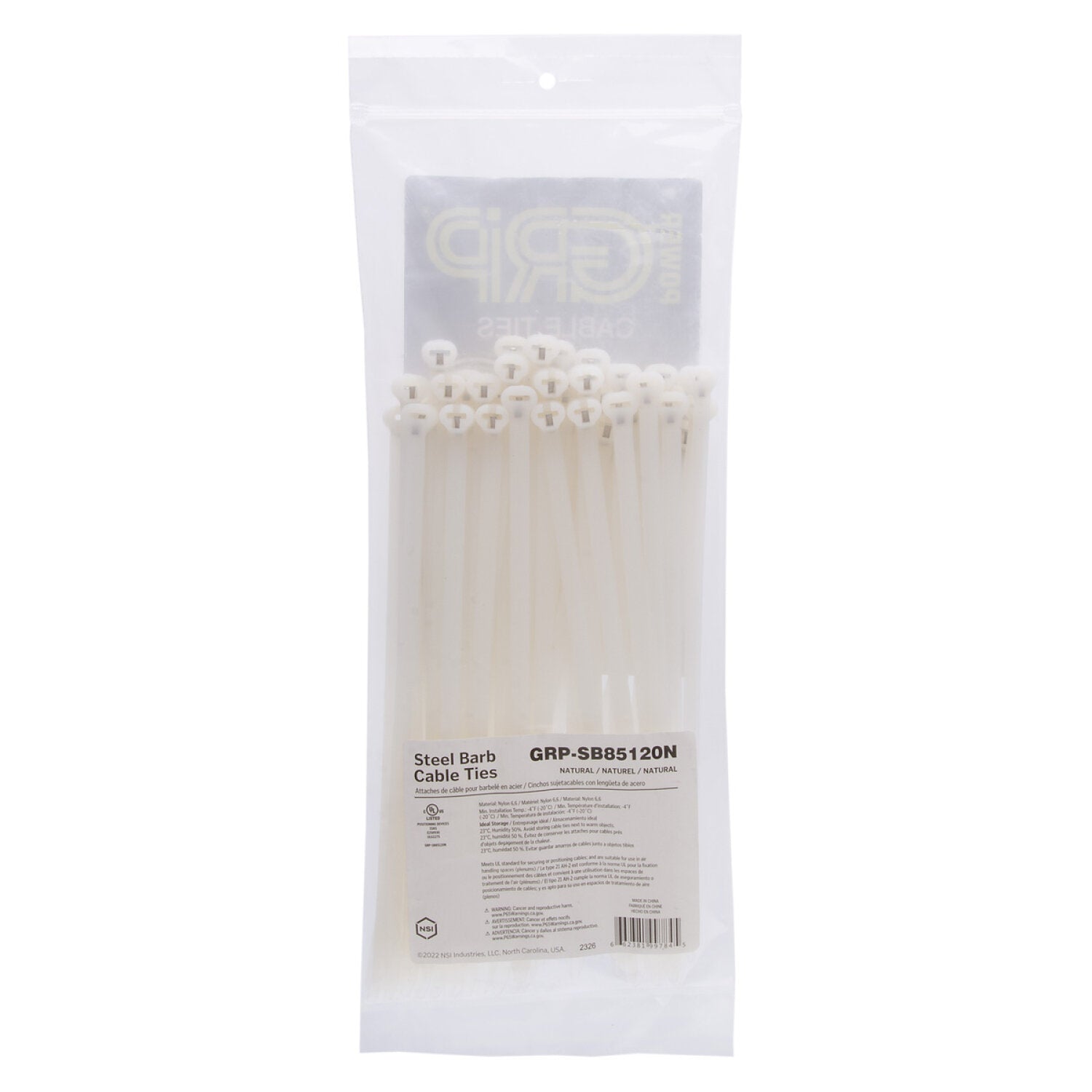 NSI GRP-SB85120N 8.5”, Natural Steel Barb 120lb Cable Tie, 50 Pack