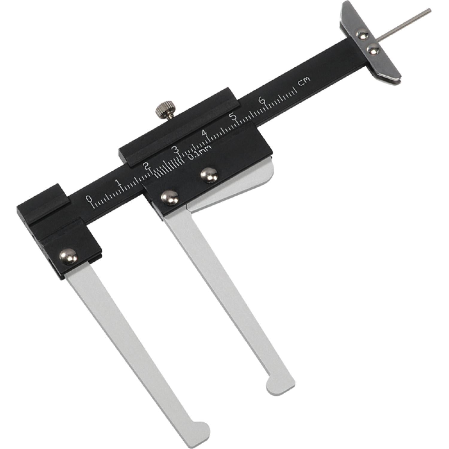 2 in 1 Brake- and Tyre Profile-Calliper. For measuring the thickness of built-in braking discs of passenger cars and motorbikes, made of stainless steel, with locking screw and additional tyre profile-calliper, Measuring range: 0-60 mm.