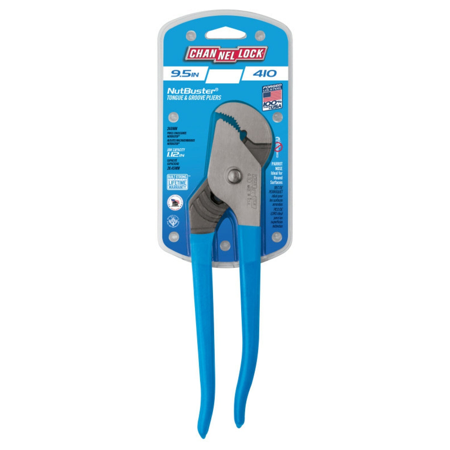 CHANNELLOCK® 410 9.5" Tongue & Groove Pliers have a special parrot nose and double tongue & groove design that gives this NUTBUSTER® added strength, ideal for round surfaces. These pliers are built to last with a PERMALOCK® fastener to eliminate nut and bolt failure, patented reinforcing edge to minimize stress breakage and laser-hardened teeth to provide a better, longer lasting grip. These pliers include an added SAFE-T-STOP® feature to prevent finger pinch with the combination of a lower jaw design and an expanded reinforcing rib preventing unwanted handle contact. CHANNELLOCK® NUTBUSTER® Pliers are made in USA and forged from high carbon U.S. steel that is specially coated for ultimate rust prevention.