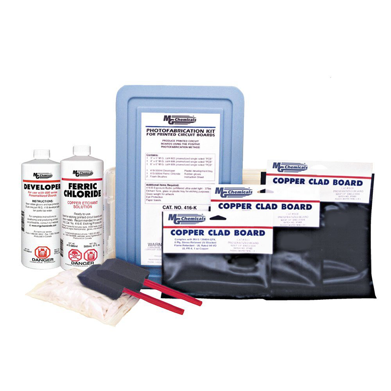 This MG Chemicals 416-K photofabrication kit is a 9-piece set of items needed for producing a printed circuit board using positive photofabrication. It includes three presensitized, single-sided copper clad boards (3 x 5, 4 x 6, and 6 x 6", L x W) for transferring printed images during the exposure process. A bottle of Positive Developer and a plastic tray are provided for developing the image, and a bottle of ferric chloride and two foam brushes are provided for removing copper from the board during the etching process. Protective gloves and instruction sheet are also included. The materials in this photofabrication kit are compliant with either UL #E214381 for materials used in the fabrication of printed wiring boards, Restriction of Hazardous Substances (RoHS), or California Air Resources Board (CARB). Contains sodium hydroxide; protective gloves, clothing, and eye protection must be worn.