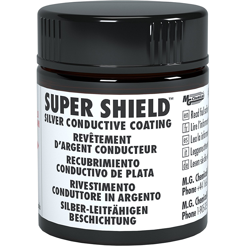 The 842AR Silver conductive coating is a highly conductive coating that protects electronic devices in plastic Enclosures from high frequency electromagnetic and radio frequency interference (“EMI/RFI”). it is a durable acrylic lacquer pigmented with a high purity Silver flake. It is easy to use solvent based system, with no heat cure necessary. It has excellent conductivity, strong adhesion to plastics, great oxidation resistance, and has a wide variety of applications. The 842AR is designed to provide a highly conductive surface to the interior of plastic electronic Enclosures to suppress high frequency EMI/RFI emissions, allowing compliance to FCC rules, and protecting the device from external EMI/RFI, preventing possible malfunction. Silver is offers the strongest EMI/RFI suppression, especially at higher frequencies, and it can be applied very thin, so it is the optimal pigment for short range EMI applications, such as board level or component to component applications. It is also optimal in military, medical, or other mission critical applications, where the highest levels of attenuation are essential. 842AR adheres well to wood, copper, aluminum, and many other surfaces beyond just plastics. It is a simple an effective solution to many applications where it is necessary to impart maximum conductivity to a surface. Applications: repairing damage to existing shielding, conductive undercoat for electroplating, providing electric continuity for circuits, medical equipment, military equipment, scientific equipment, Test equipment, communication devices, cellphones, laptops, pda’s, consumer electronics, automotive applications, aerospace applications, drones and other RC vehicles.