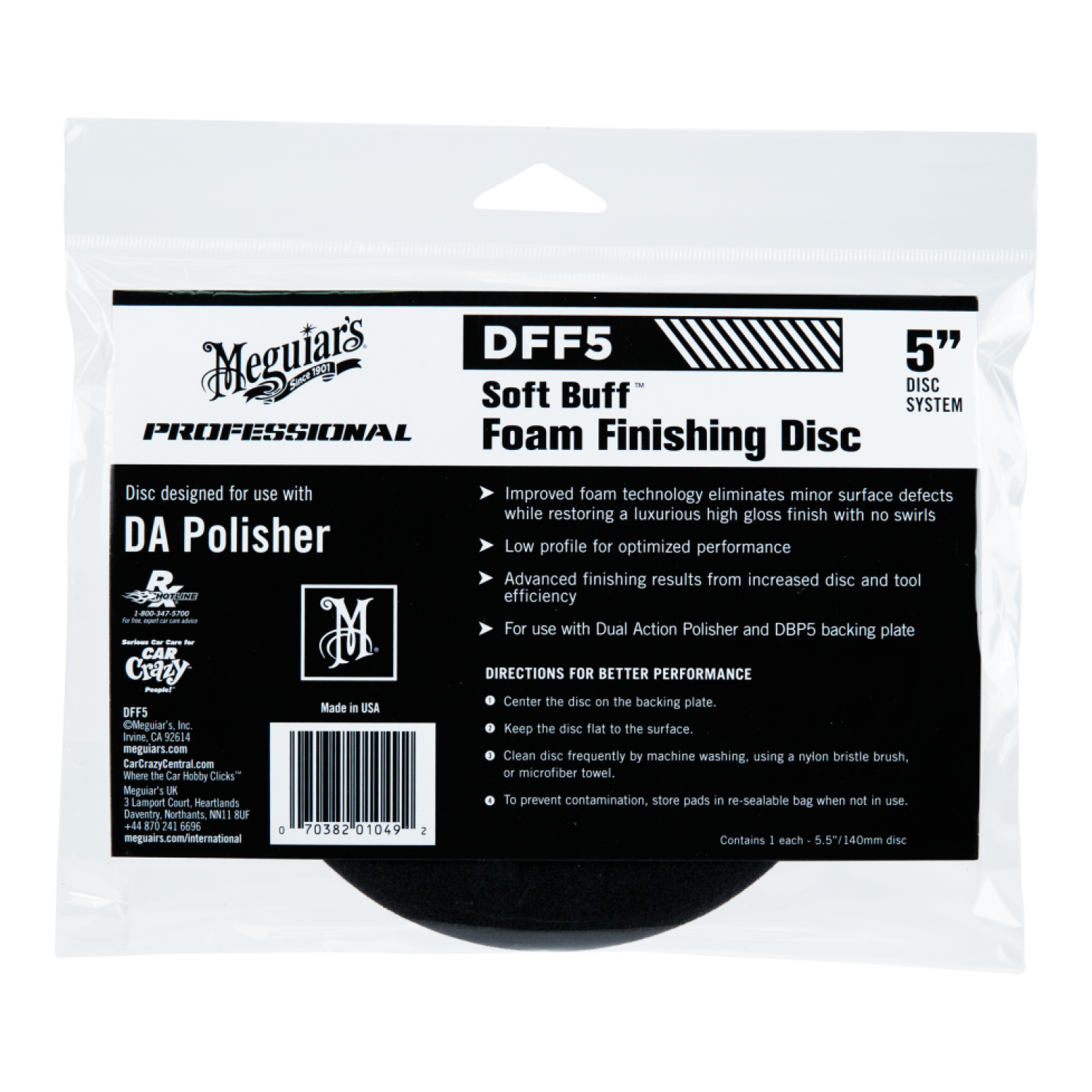- Hook and loop system sticks firmly and ideally mates up with Meguiar's® DBP5 - 5" Soft Buff™ DA Backing Plate