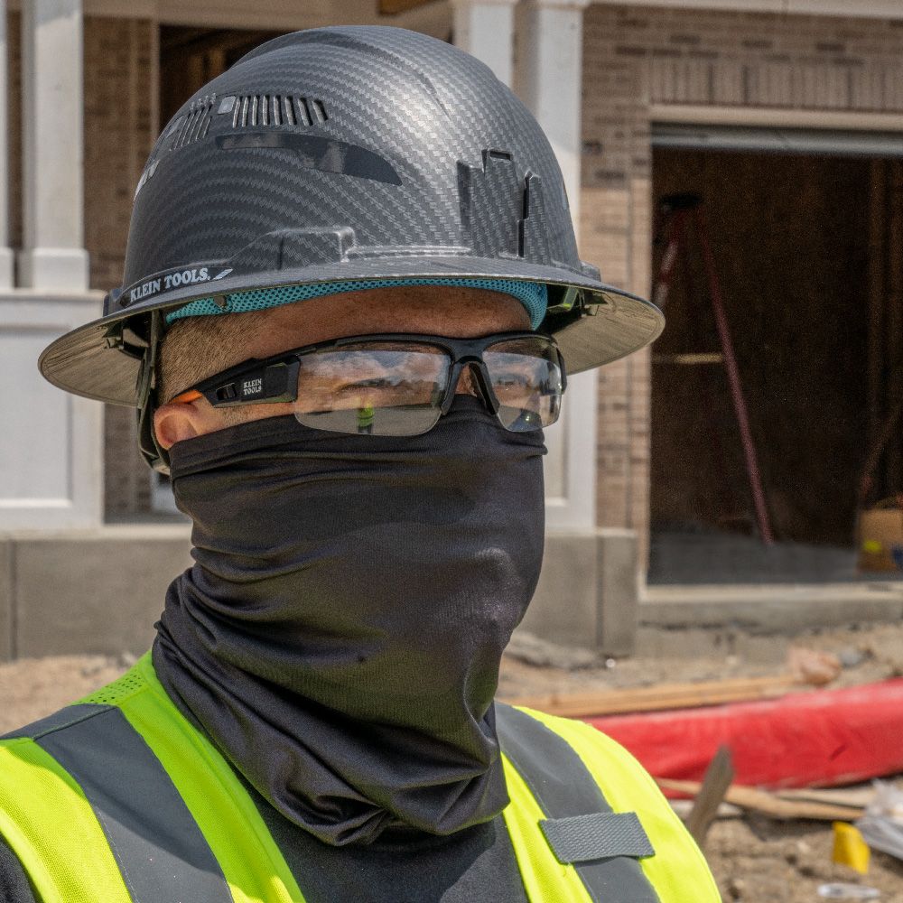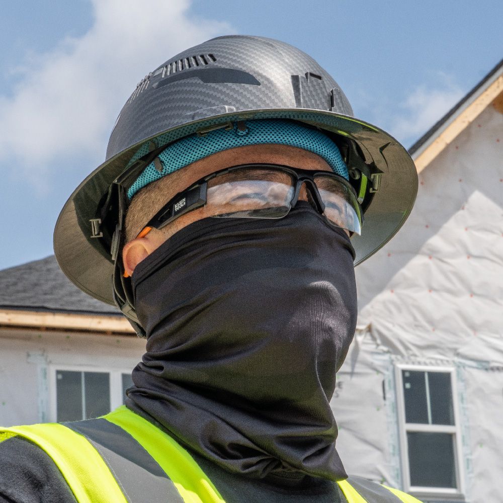Klein Tools' Neck and Face Cooling Band can be worn wet or dry and has UPF 50+ protection. Cooling is immediate after getting wet and will last for hours. This cooling band is made with super evaporative performance knit fabric and has non-fraying, finished elastic edges. Anti-odor treatment provides long-lasting freshness. Wear under a hard hat or alone. Available in blue or high-visibility yellow.