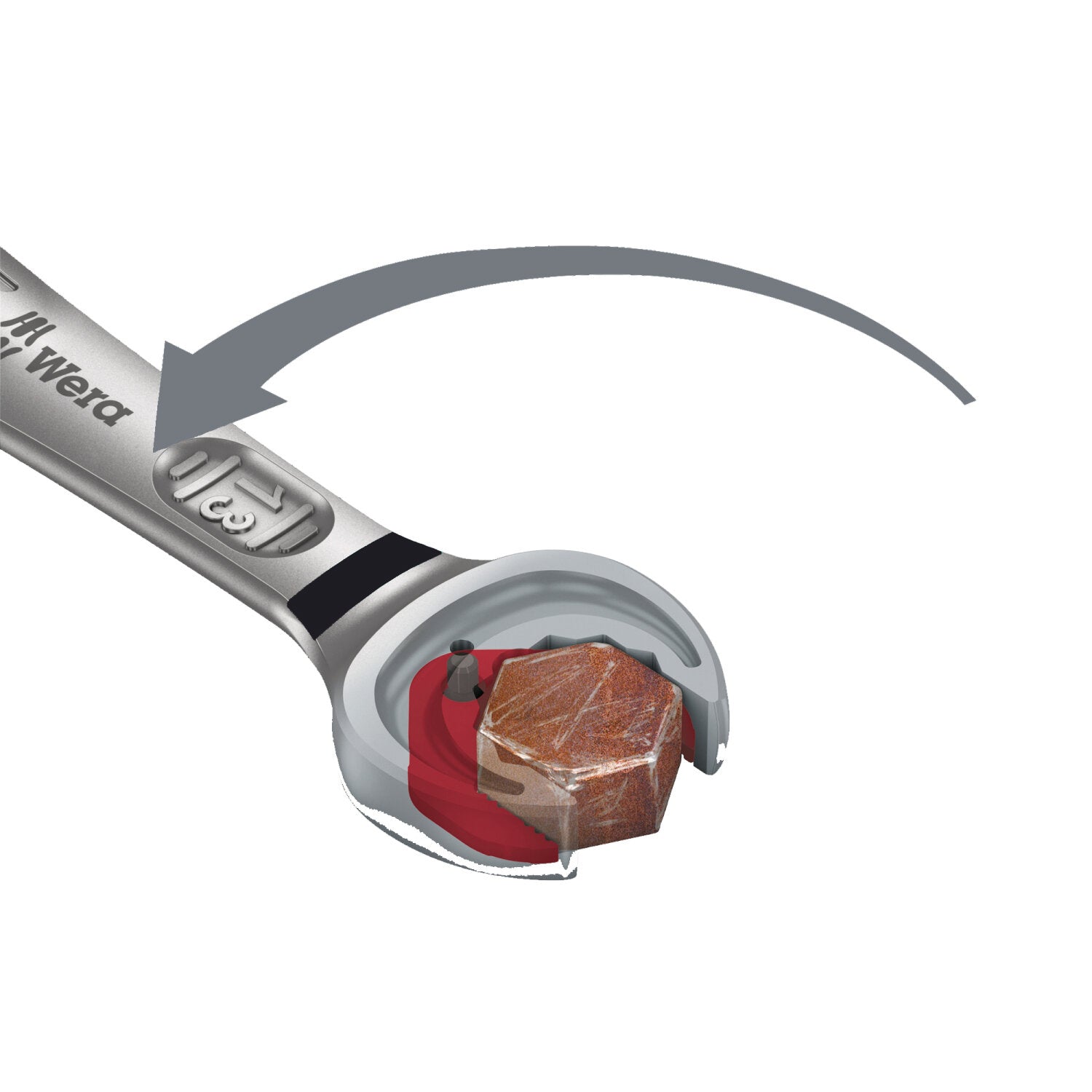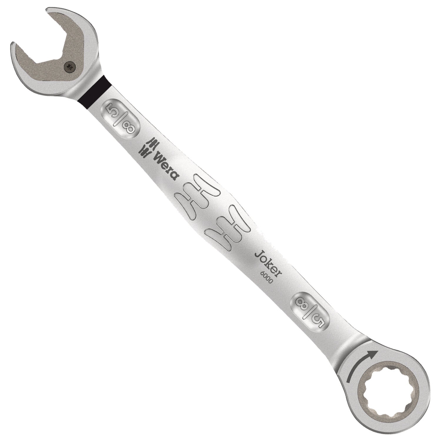 High quality, imperial, combination ratchet wrench by Wera. Everything that a wrench has to be able to do. And a whole lot more. Faster, better, stylish. Yes, a real Joker. The new generation of combination ratchet wrenches. Suitable for hexagon socket screws, bolts or nuts. Comes with holding function, thanks to the metal plate in the jaw, which reduces the risk of dropping nuts and bolts. The replaceable metal plate in the jaw secures nuts and bolts with its extra hard teeth and reduces the danger of slipping. The integrated limit stop prevents any slipping around the bolt head and allows higher torque to be applied. The double-hex geometry makes for a positive connection with nuts or bolts and reduces the risk of slipping. A return angle of only 30° at the open end prevents any time consuming flipping of the wrench. The ratchet mechanism at the ring end, with an exceptional, fine-tooth mechanism - 80 teeth in all - enables flexibility even in very confined working spaces. The specially forged geometry ensures high torque transfer and strength. The ratchet is manufactured out of high performance chrome molybdenum steel with nickel-chrome coating for high corrosion protection. "Take it easy" Tool Finder with colour coding according to sizes.