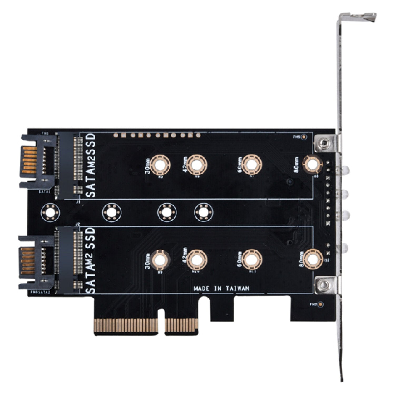 ECM27 1-slot NVMe and 2-slot SATA M.2 SSD to PCI-E x4 adapter Card ECM27 is a M.2 NVMe / SATA M.2 SSD adapter card designed for users who wishes to add or expand M.2 SSDs in their system utilizing PCI Express x4 lane or SATA interface. The card supports a total of 3 M.2 SSDs, of the 3, 1 slot utilizes PCIe interface for M Key M.2 SSD and the other 2 utilizes SATA III interface for B Key M.2 SSDs.