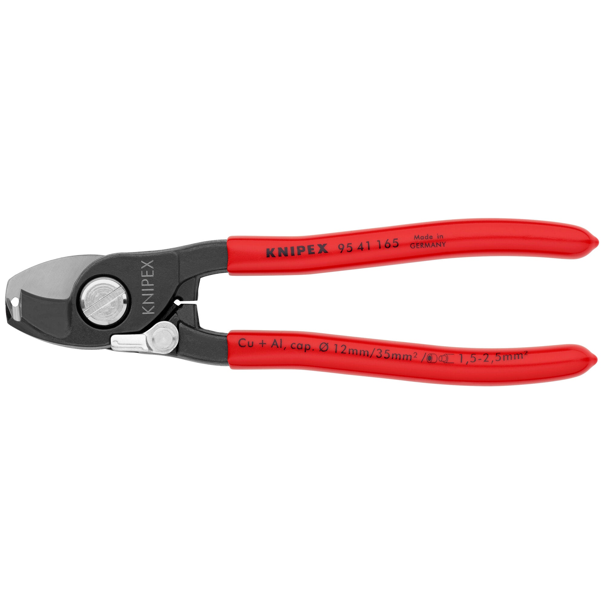 Multifunctional tool for working on NYM cable from 3 x 1.5 mm² to 5 x 2.5 mm² (cutting, stripping insulation); universal stripping area for both solid conductor cross-sections; reliable alignment of the cable in the stripping area due to V-shaped blade geometry. For cutting copper and aluminum cables, single and multi-stranded wire. Not suitable for steel wire and hard drawn copper conductors. Precision ground, hardened blades. Clean and smooth cut without crushing and deformation. Easy cutting with one-hand operation. Pinch guard prevents operators' fingers being pinched. Adjustable bolted joint, self-locking. High-grade special tool steel; forged, oil-hardened.