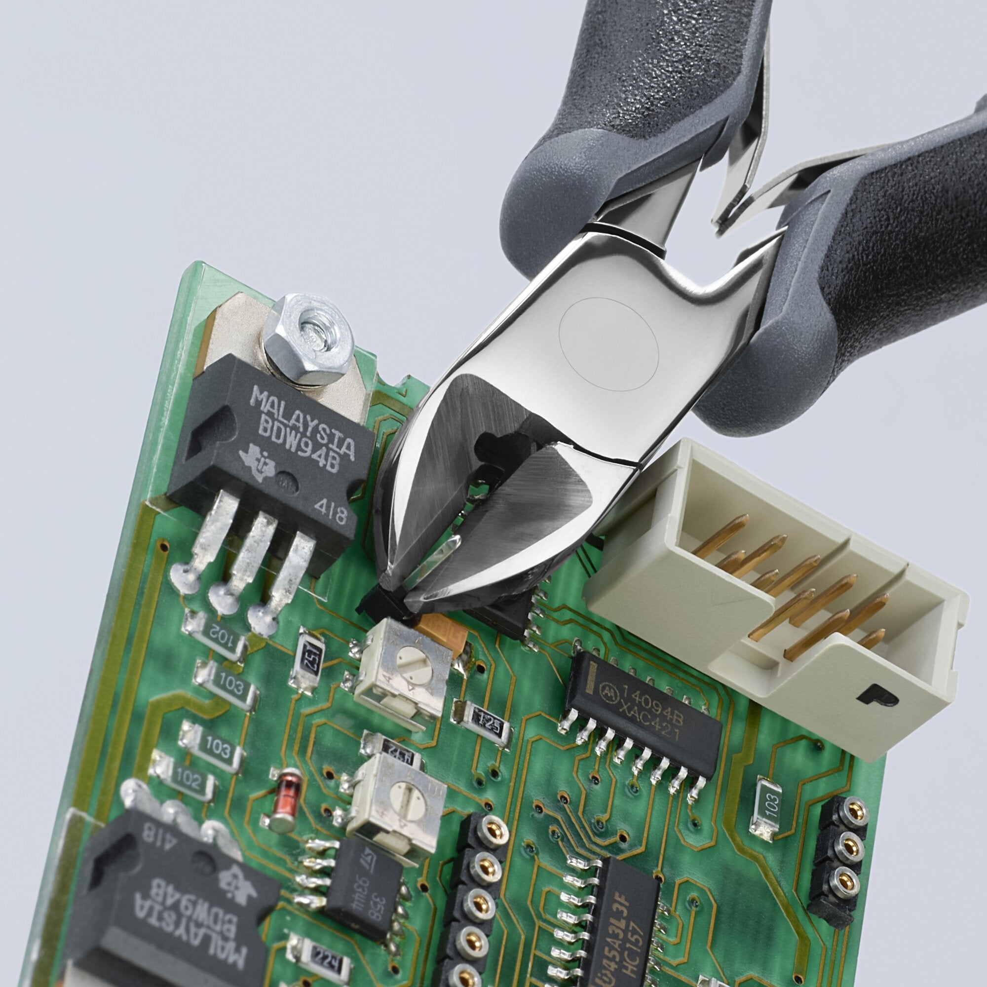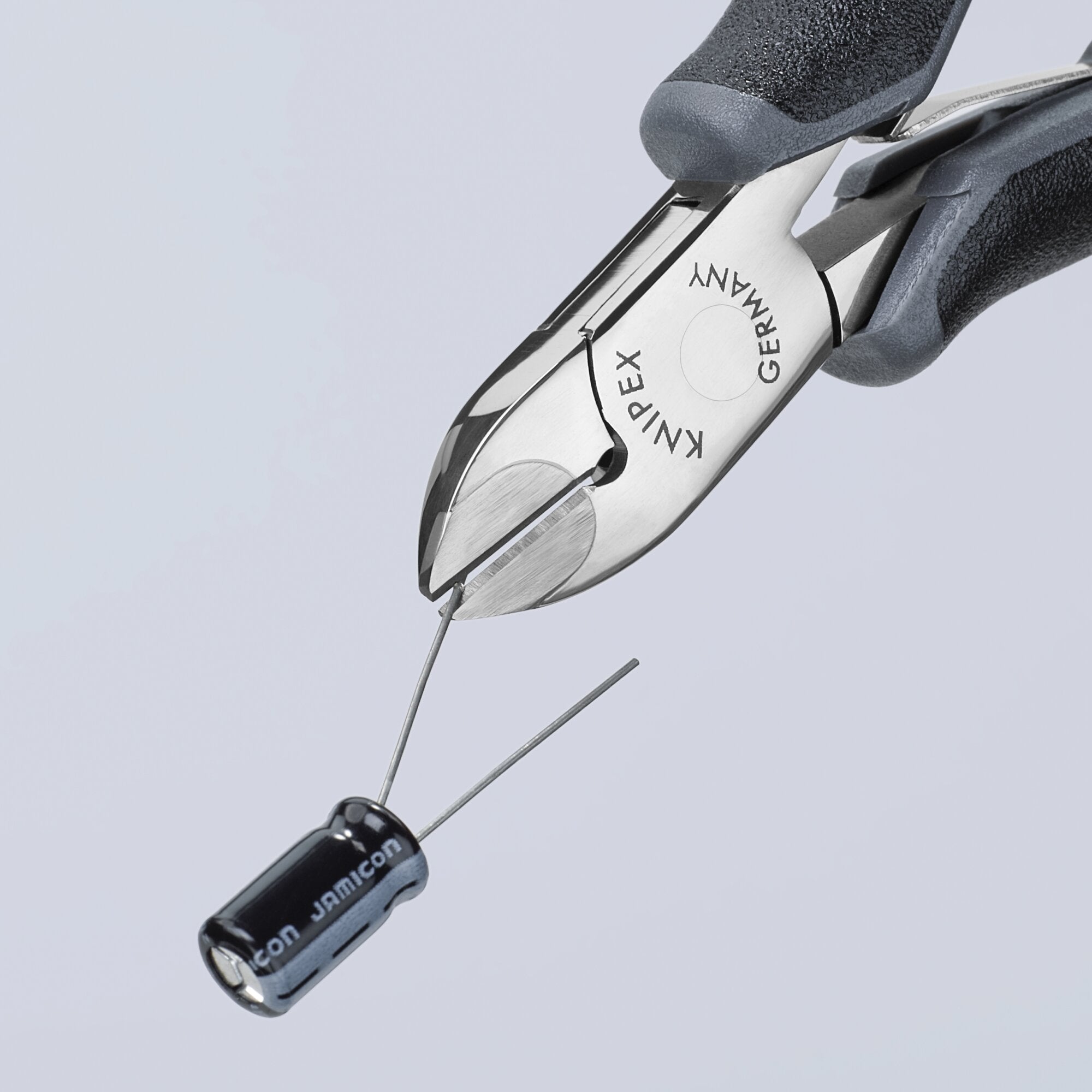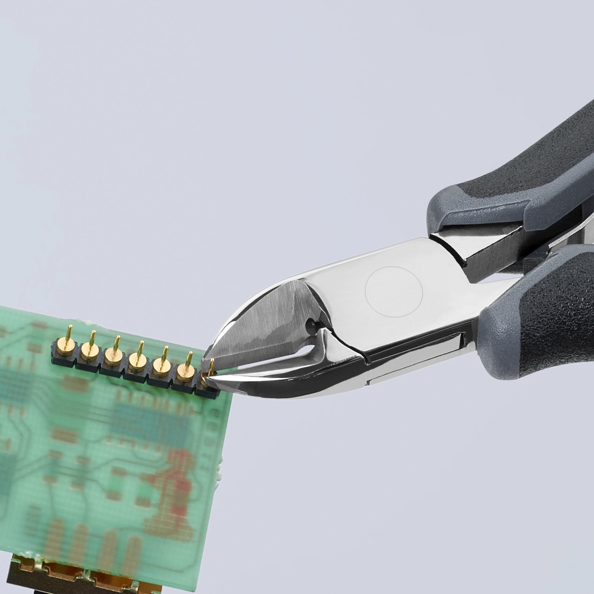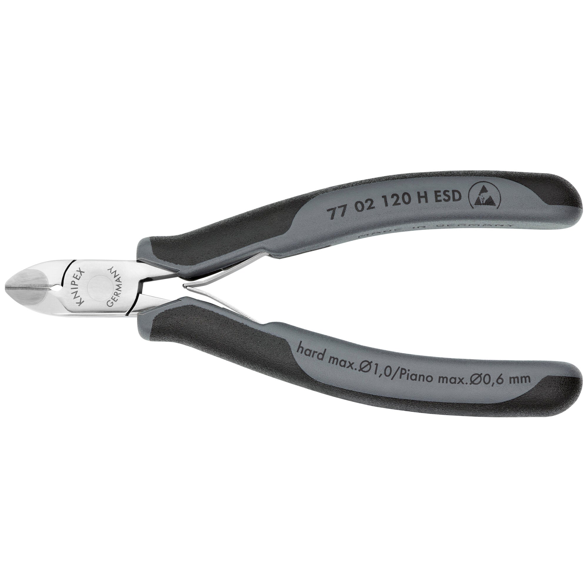 For extreme demands on cutting pliers caused by hard or tough materials, e.g. piano, nickel, tungsten and diode wire, which are used more frequently in the electronics and aerospace industries. Precision carbide metal cutting edges soldered into forged blanks. Sturdy, zero backlash box-joint. Hardness of the carbide cutting edges (approx. 80 – 83 HRC). Pliers with carbide metal cutting edges have a substantially longer service life than with conventional cutting edges. Constantly reliable cutting results due to the avoidance of cutter deformations. High cost savings due to longer service life of the pliers. Semi-flush with bevel. ESD (electrostatic discharge) handles discharge electrostatic energy through the handles in a gradual and controlled manner which protects components endangered by electrostatic discharge. Hardness of the carbide cutting edges 80 – 83 HRC. Pliers with carbide metal cutting edges have a substantially longer service life than such with conventional cutting edges. High cost saving due to longer service life of the pliers. Handles with multi-component covers. Round head.