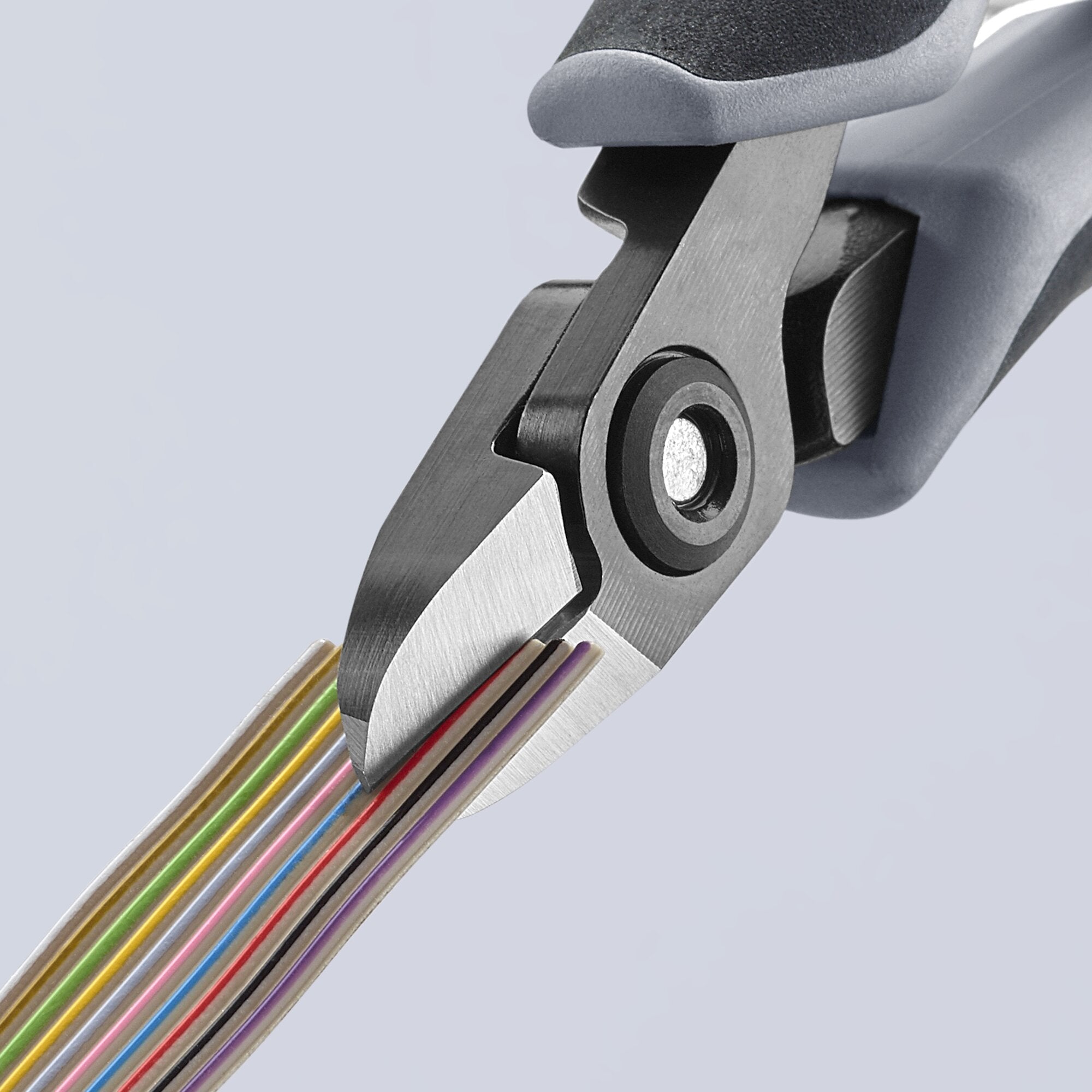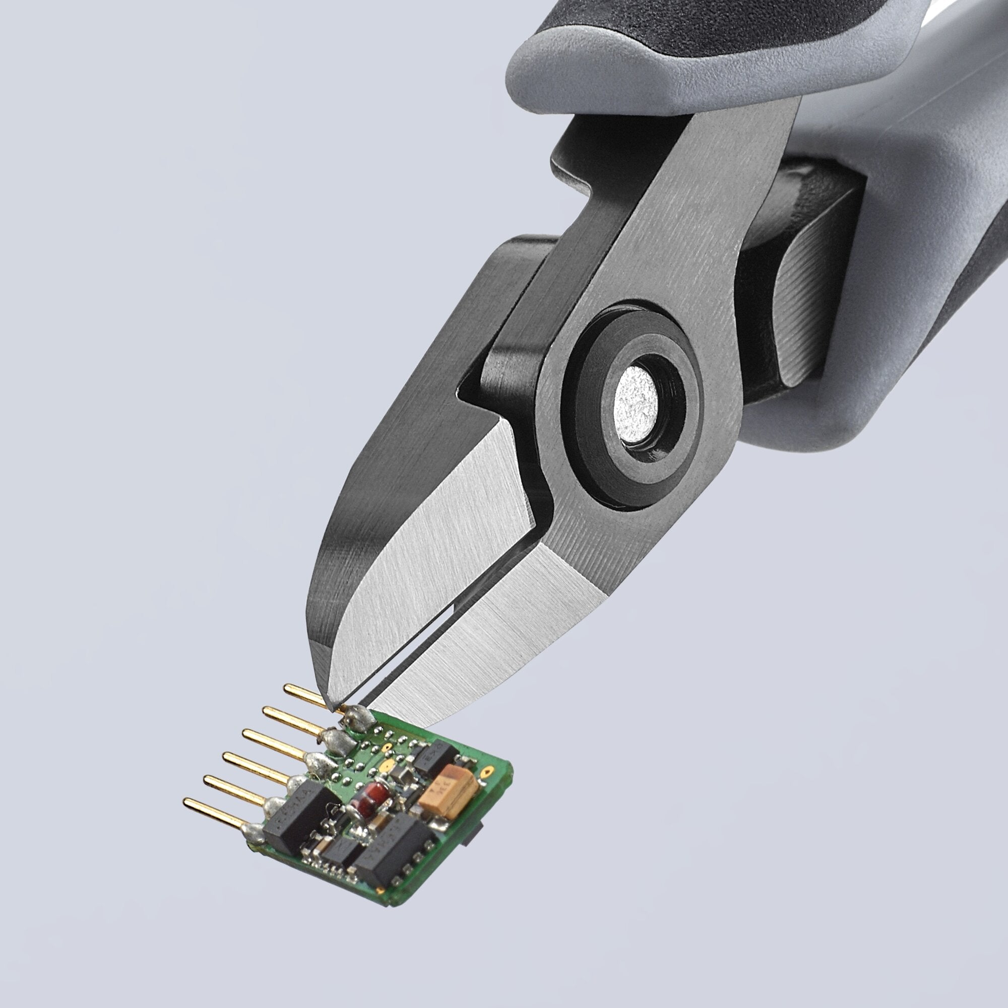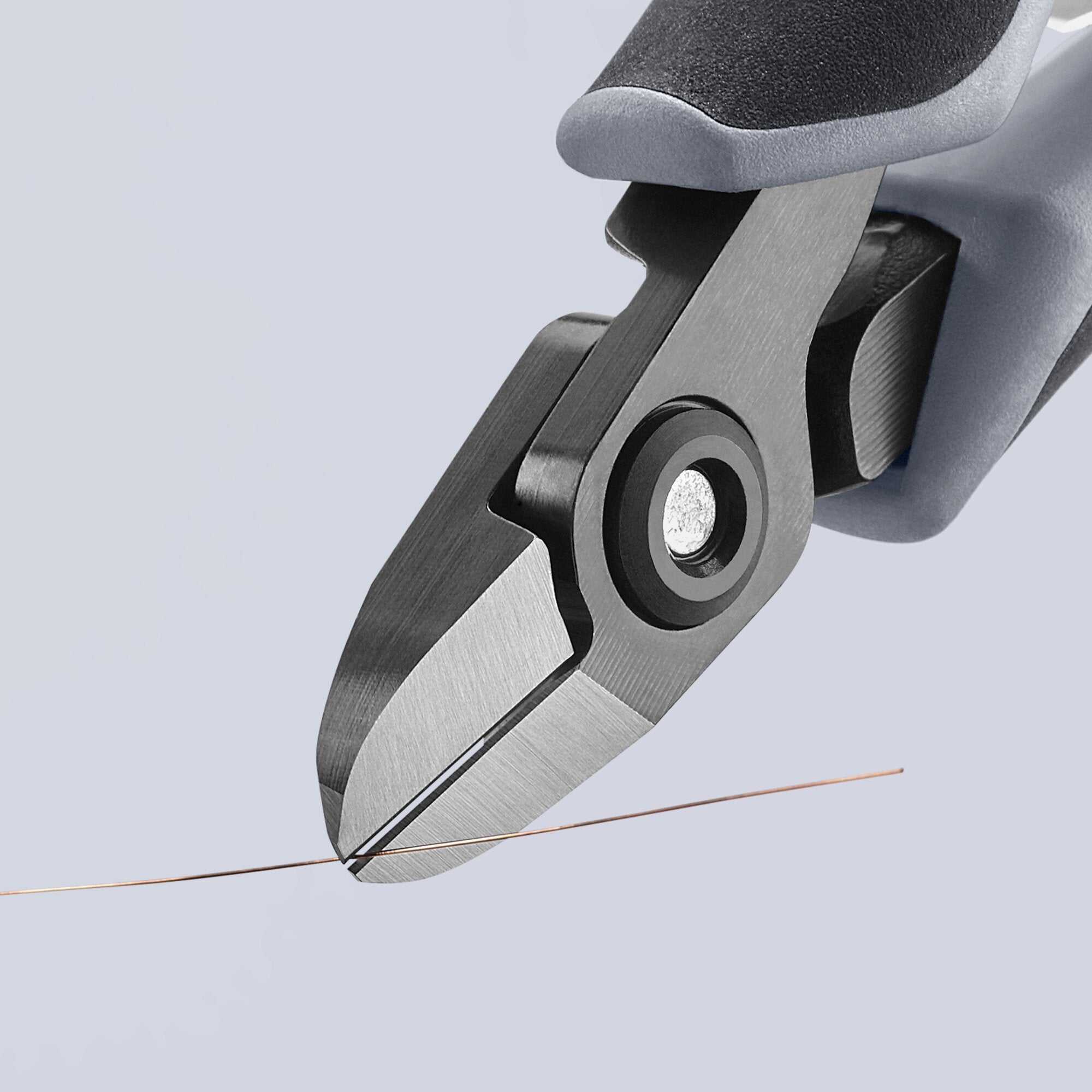 Precision pliers for ultra fine cutting work in electronics and fine mechanics. Very precisely ground and sharp cutting edges with very small bevels for precise cutting work on small electronic components. Cutting edge hardness (approx. 64 HRC). Approx. 20% lighter than conventional electronics pliers. Bolted joint with carefully manufactured joint surfaces for even,. Low-friction movement throughout the entire opening range. Double spring for a gentle and even opening. Optimized handle grips for comfort. Round head. ESD (electrostatic discharge) handles discharge electrostatic energy through the handles in a gradual and controlled manner which protects components endangered by electrostatic discharge. Ball bearing chrome steel; forged, multi stage oil-hardened. Pliers burnished. Very small bevel. Semi-flush cut.