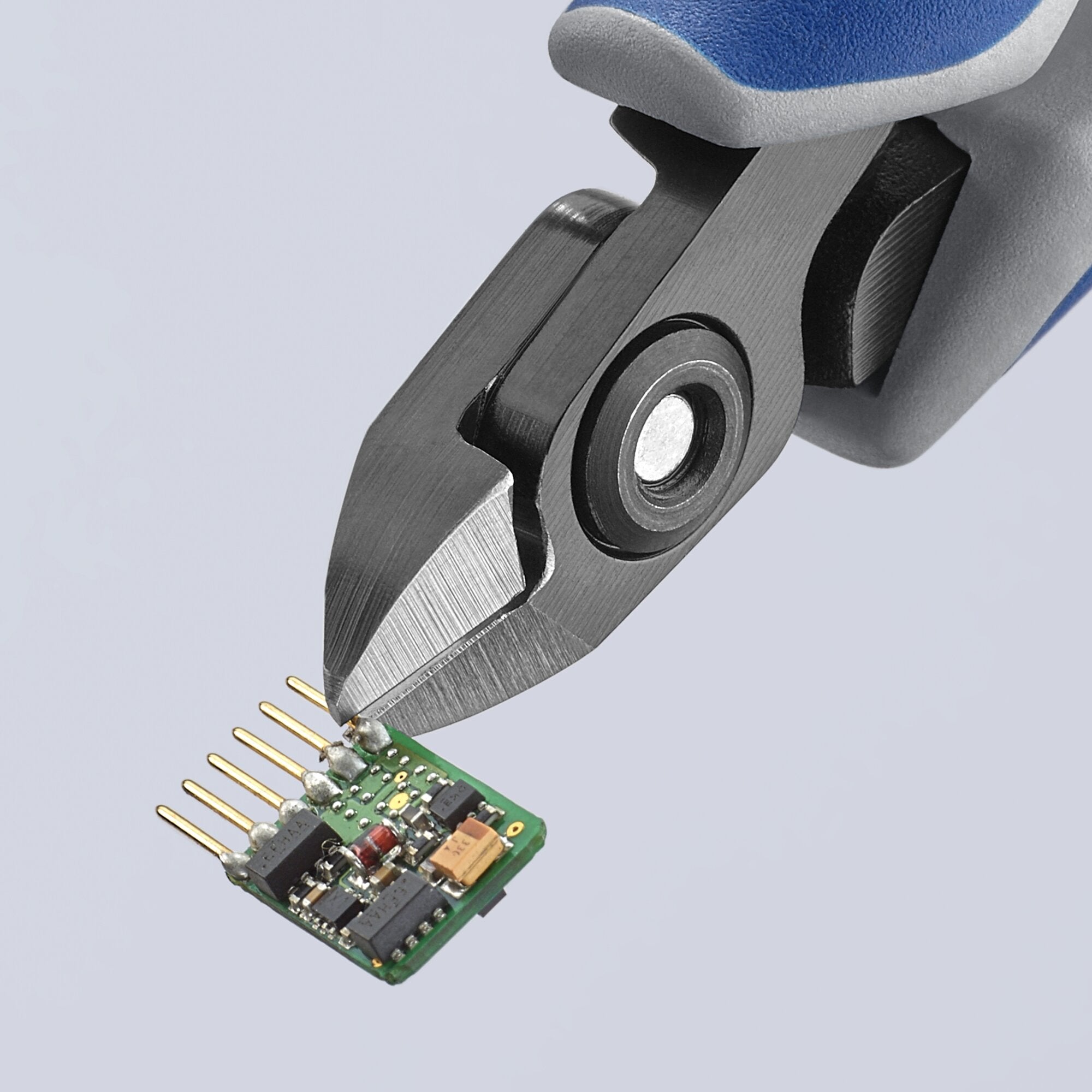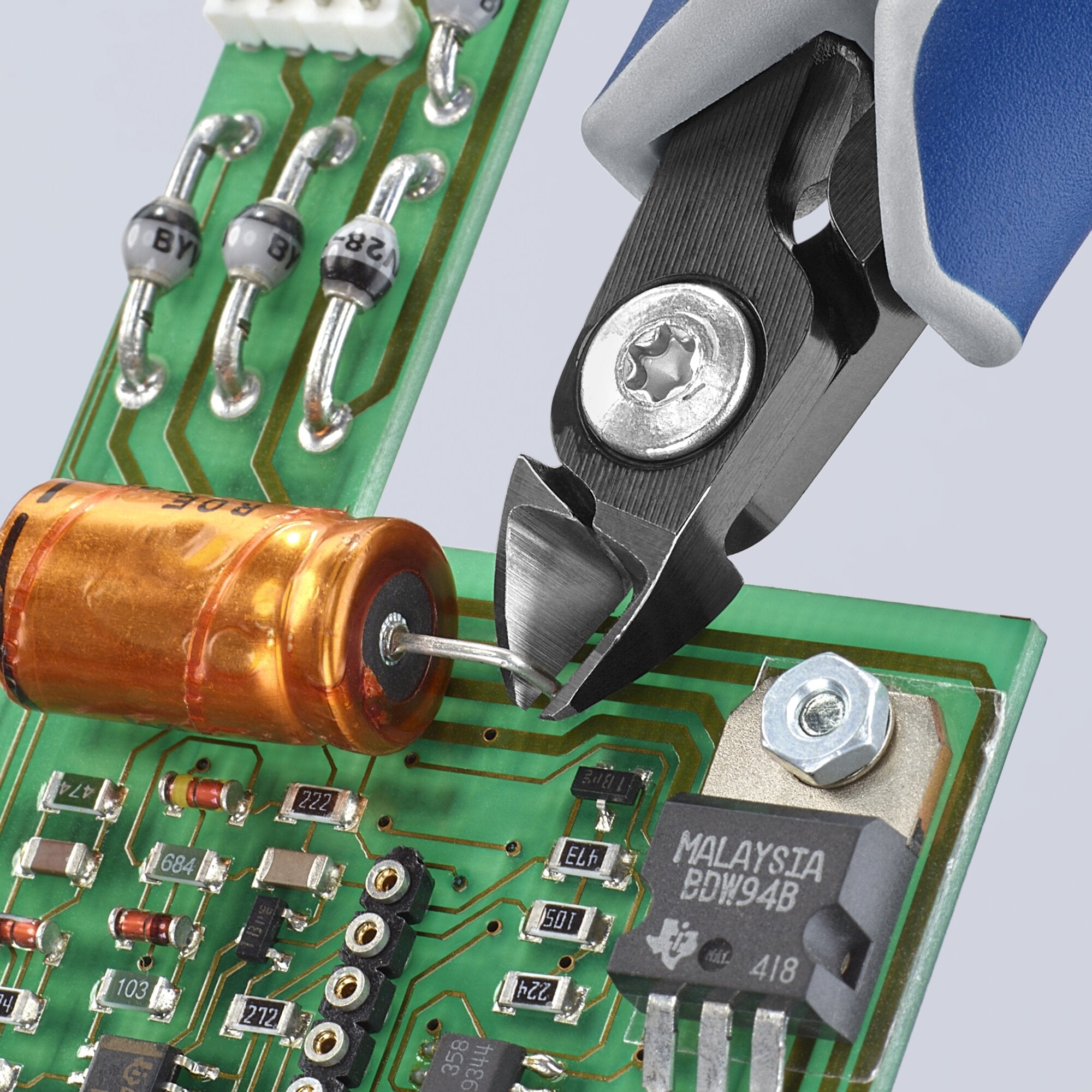 Precision pliers for ultra fine cutting work in electronics and fine mechanics. Very precisely ground and sharp cutting edges with very small bevels for precise cutting work on small electronic components. Cutting edge hardness (approx. 64 HRC). Approx. 20% lighter than conventional electronics pliers. Bolted joint with carefully manufactured joint surfaces for even,. Low-friction movement throughout the entire opening range. Double spring for a gentle and even opening. Optimized handle grips for comfort. Mini-head. Ball bearing chrome steel; forged, multi stage oil-hardened. Flush cut. Pliers burnished.