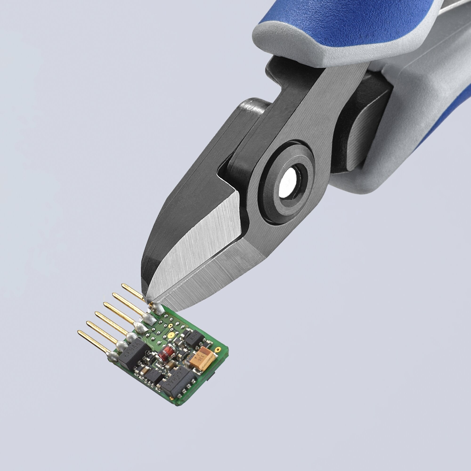 Precision pliers for ultra fine cutting work in electronics and fine mechanics. Very precisely ground and sharp cutting edges with very small bevels for precise cutting work on small electronic components. Cutting edge hardness (approx. 64 HRC). Approx. 20% lighter than conventional electronics pliers. Bolted joint with carefully manufactured joint surfaces for even,. Low-friction movement throughout the entire opening range. Double spring for a gentle and even opening. Optimized handle grips for comfort. Round head. Ball bearing chrome steel; forged, multi stage oil-hardened. Flush cut. Pliers burnished.
