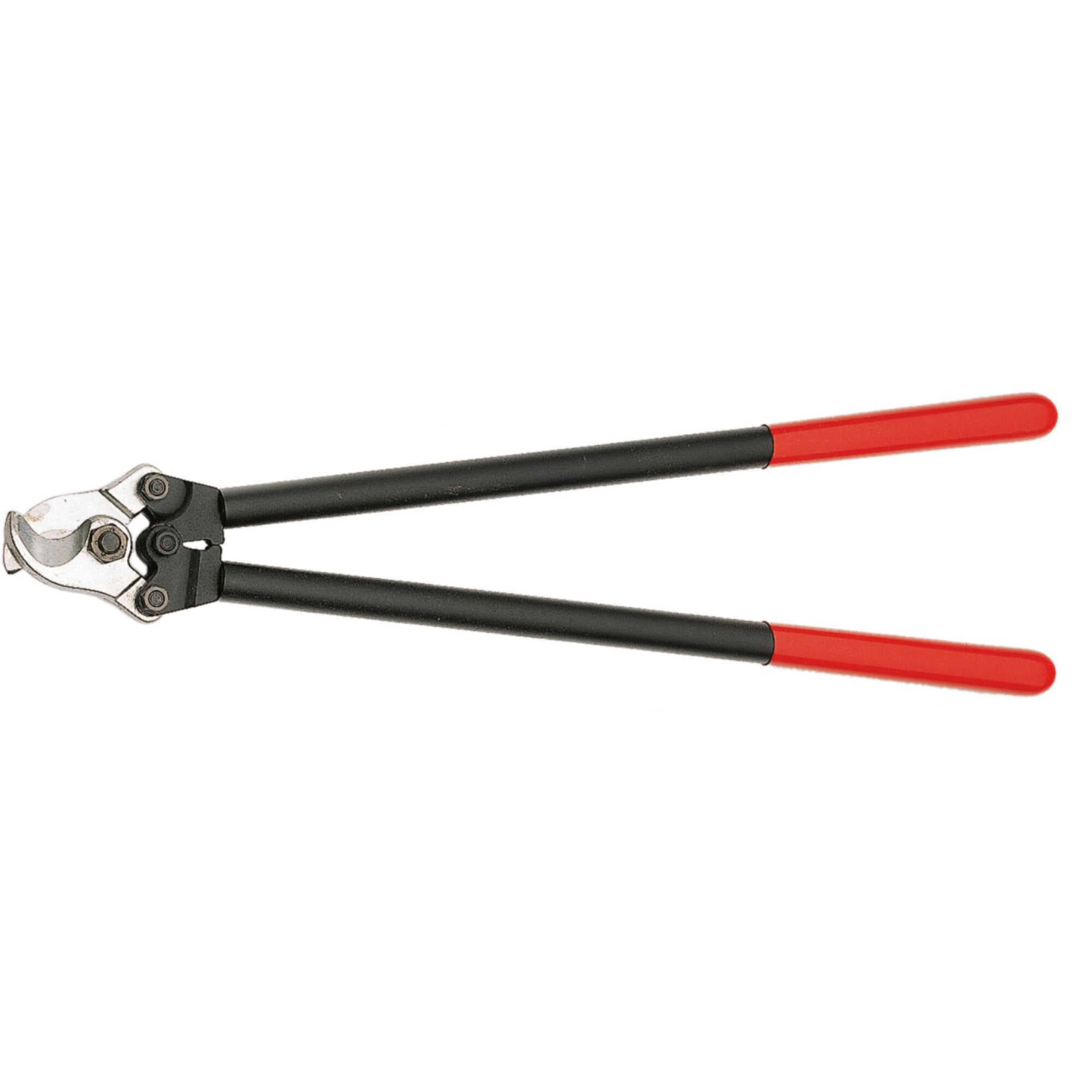 For cutting copper and aluminum cables, single and multiple wire. Not for ACSR, steel wire and hard drawn copper conductors. Precision ground, hardened blades. Clean and smooth cut without crushing and deformation. Adjustable bolted joint. Pinch guard prevents operators' fingers being pinched. Cutting capacity - up to 1 1/16" conductor or 6/0 AWG. Bolted cutter head, replaceable. For replacement head use part number 95 29 600. Handles are made of steel tubing. Cutter head made of vanadium electric steel, forged, oil hardened.