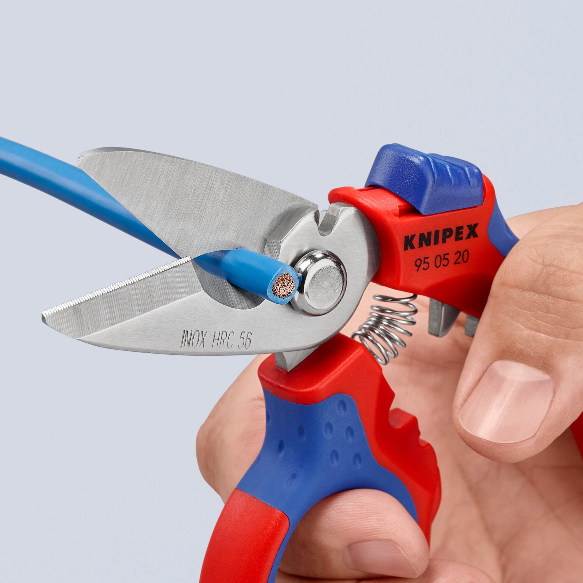 The 45° angled shears provides a natural extension of your hand which offers a more comfortable working position. In addition to comfort, the angle also allows for better sight lines when working in confined spaces – being able to see what you are cutting is critical in getting the job done quickly, accurately and efficiently. Precision-ground stainless steel blades with fine serrations offer a clean and non-slip cut. Two end ferrule crimping areas – one for 10 - 20 AWG and one for 4 - 8 AWG. Includes opening spring and lock for easy storage and transport. Additional wire cutter located in front of the slide lock. Tether attachment point can be used with KNIPEX Tethered Tools System. Durable belt pouch (00 19 75 LE) sold separately. Cutting edges made from stainless steel, hardness of cutting edges 56 HRC. Handles with multi-component grips, fiberglass reinforced plastic.