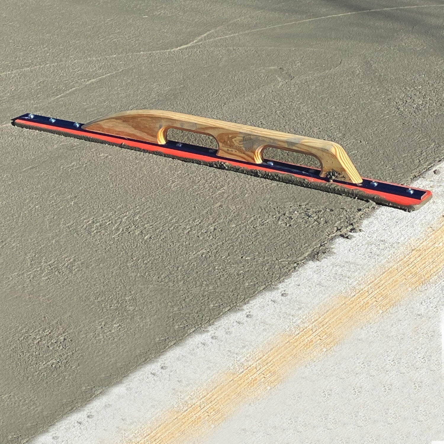 The latest technology in concrete floating! The Orange Thunder with KO-20 Technology Darby is made with the latest advancement in construction tools. Lightweight, engineered material allows for seamless motions to quickly bring up bleed water to open the surface as it levels and smooths. This 36" tapered darby features curved surface lines to evenly distribute the paste to keep the surface open longer. The blade tapers from 3-1/2" on the heel down to 2-1/2" at the nose allowing for smooth motions especially with one-handed sweeping movements. The square end blade has rounded corners to prevent gouging. KO-20 material is impact resistant for extended wear. The blade won’t absorb liquids preventing corrosion and rust. Kraft Tool's innovative new darby is reinforced with an aluminum bar to mount the 24" long smooth wood handle. Two hand holes within the handle allows for a variety of hand configurations for pushing, pulling, or one-handed sweeping motions. Patent Pending.