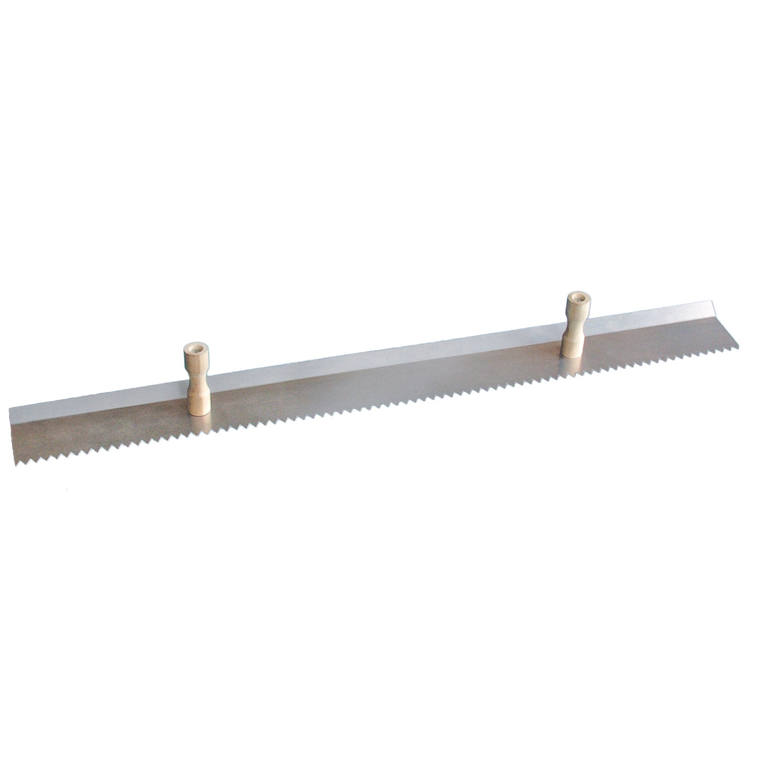 Use this 42 In. long tool to cover a wide expanse to scratch between coatings on plaster and stucco for optimal bonding. Made with of Genuine Extru-Lite magnesium which is 30% lighter than similar aluminum tools. Quality material won't rust extending the life and use of tool. The 1/2" x 1/2" v-notch allows for scratching the surface for plaster, or stucco coatings to better adhere. One edge of the blade is turned up to move through the material while adding strength and rigidity to the 42" long blade. Fitted with two wooden knob handles centered 11" from each end of the rod. Both handles are a smooth wood.