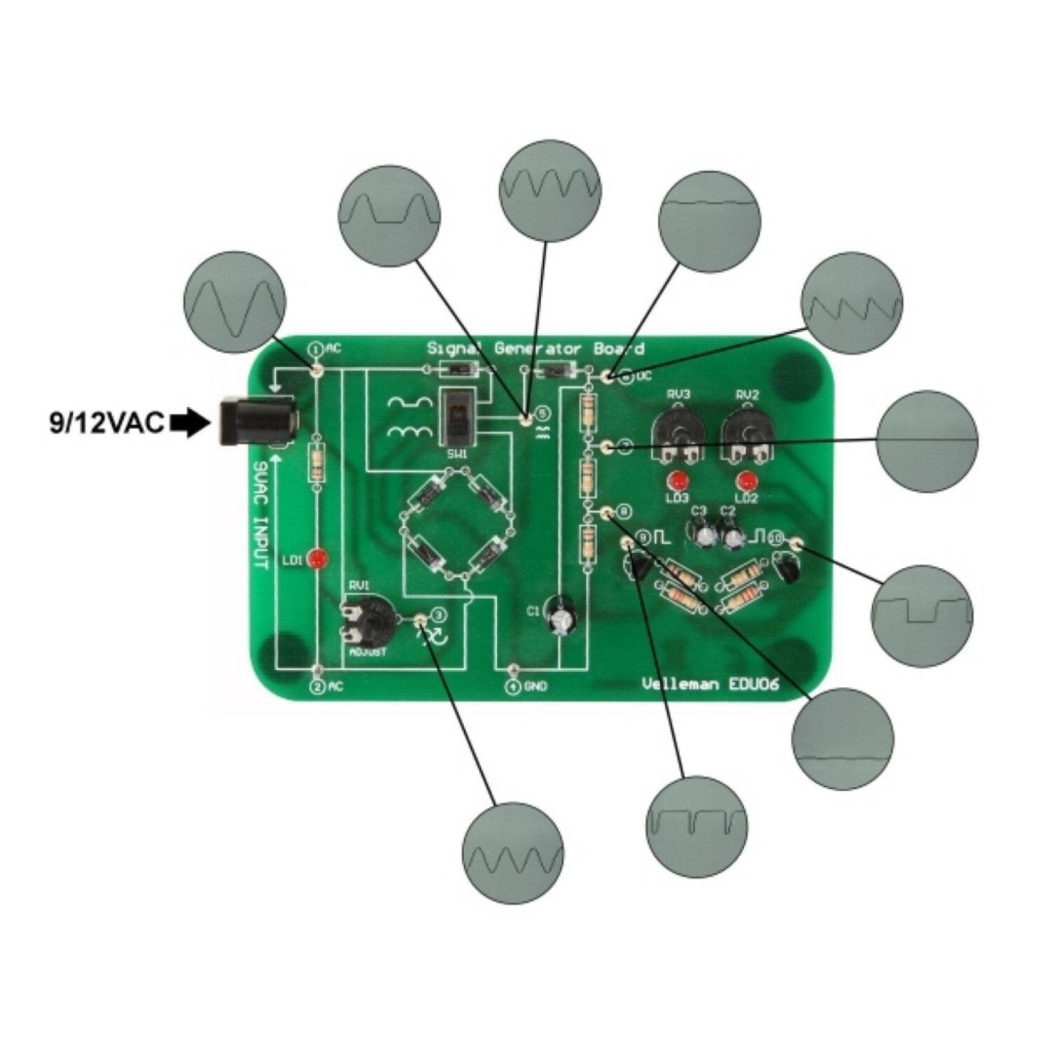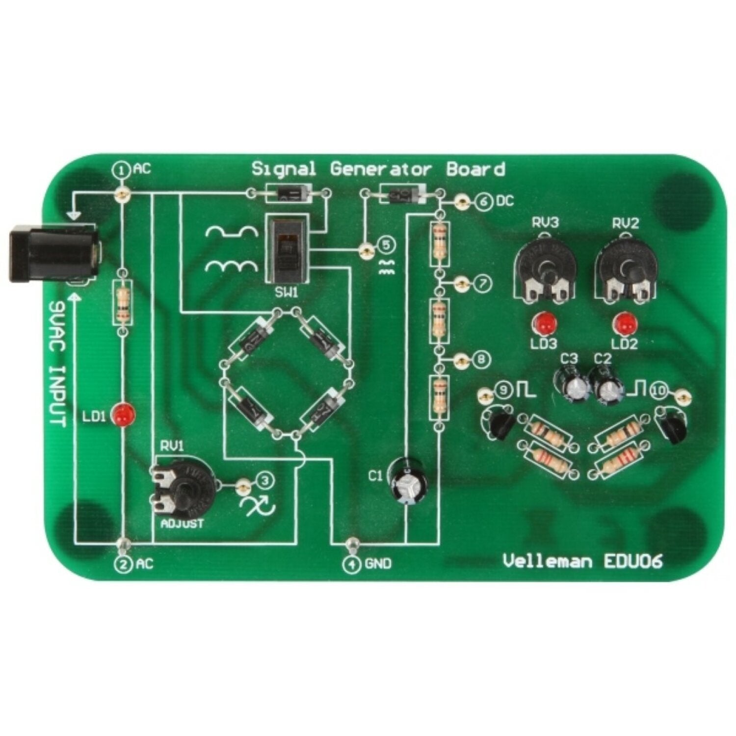 Learn how to get the most out of your digital oscilloscope. The board generates a number of safe 'real-world' signals, which we will use to perform measurements. Get familiarized with AC, DC and frequency measurements, sine and square waves, power supply ripple, full and half wave rectifiers, oscillators etc… Learn what terms such as V/div, Time/div, trigger level, auto-setup etc… mean. All experiments featured in this project are performed with the Velleman HPS140 Handheld Pocket Scope. Most experiments can be done with any digital storage scope. Some experiments can be performed with an analog scope. signals: alternating current (AC) adjustable AC full- and half wave rectified AC smoothed direct current (DC) ripple astable oscillator assembled and tested, no soldering required.