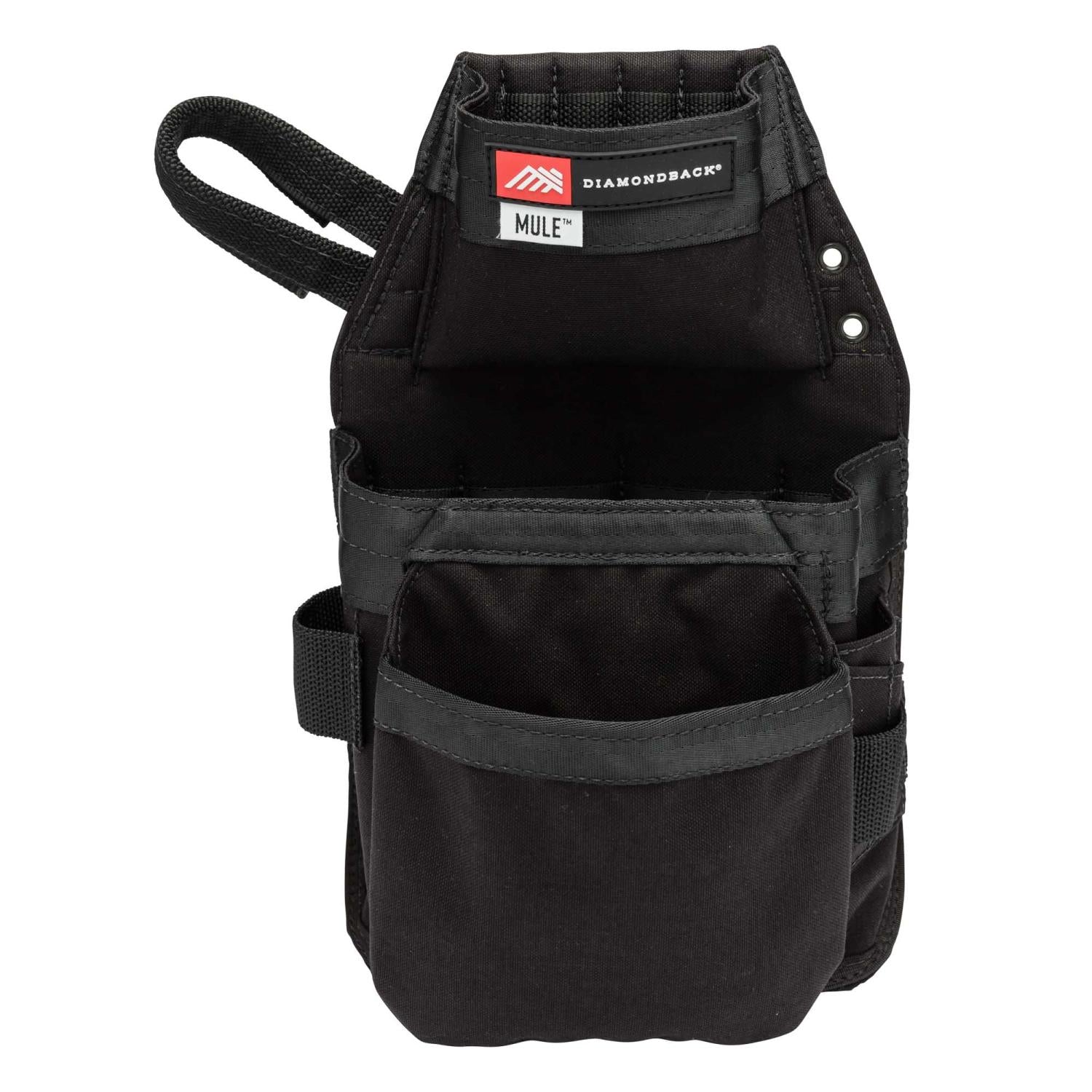 The Mule 2.0 still has the best aspects of the standard Mule, but we have updated and added a few key features. The gallon-plus main pocket has a large mouth, making access easy even in heavy duty gloves. It has ample storage space for large tools or even a driver. The internal tool slots of the main pocket are constructed to allow for a shorter break-in time. A four-slot driver bit index has been added to the top pocket. A webbing clip has been added to the backside of the pouch for hanging DB clip-on accessories or for storing slim tools.
