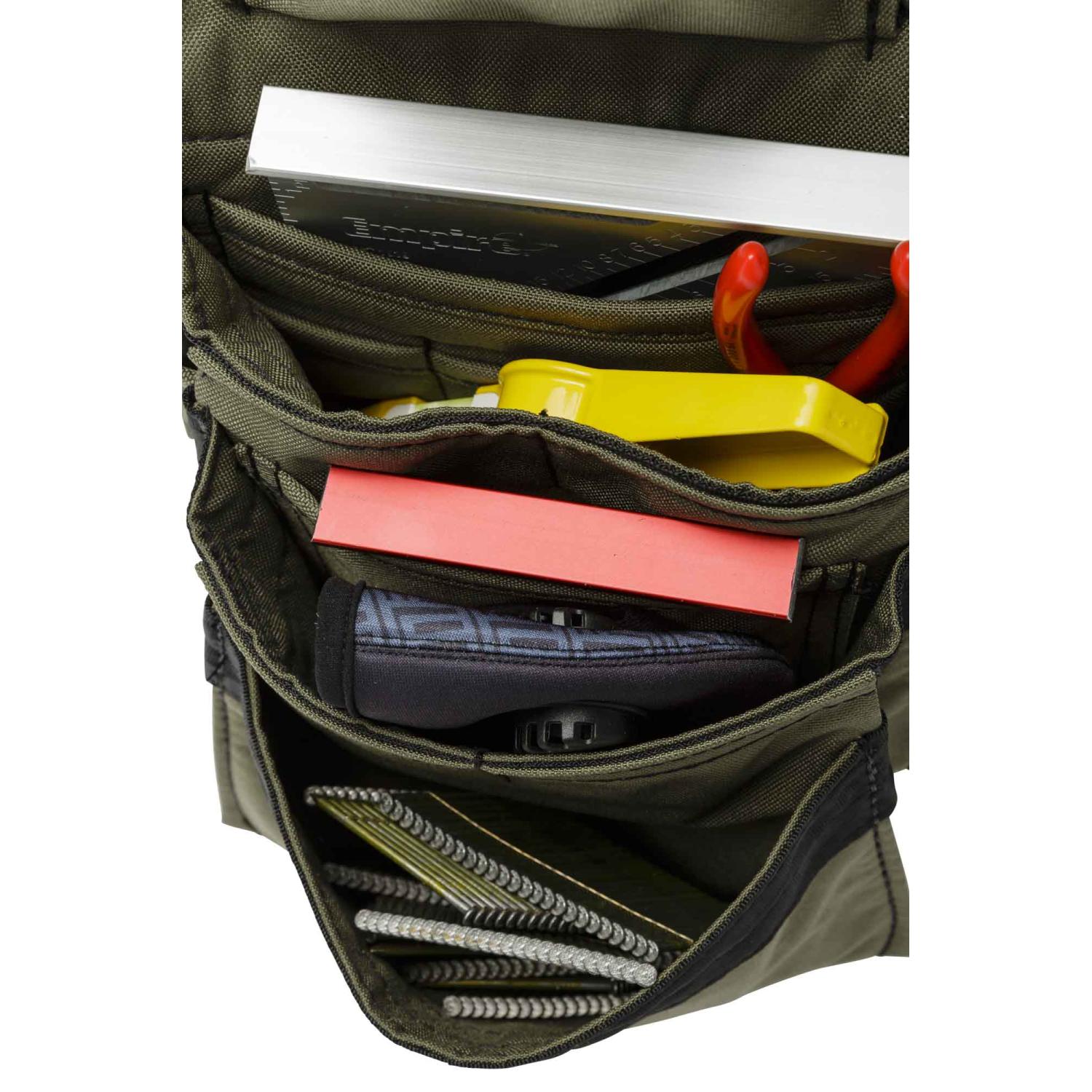 - LIGHTWEIGHT construction and ergonomic design reduces back pain and promotes overall physical health while at work and on the job. This pouch is much lighter than leather and stands up to tough everyday use. Improve your efficiency by carrying more tools and accessories while making fewer trips back to the truck.