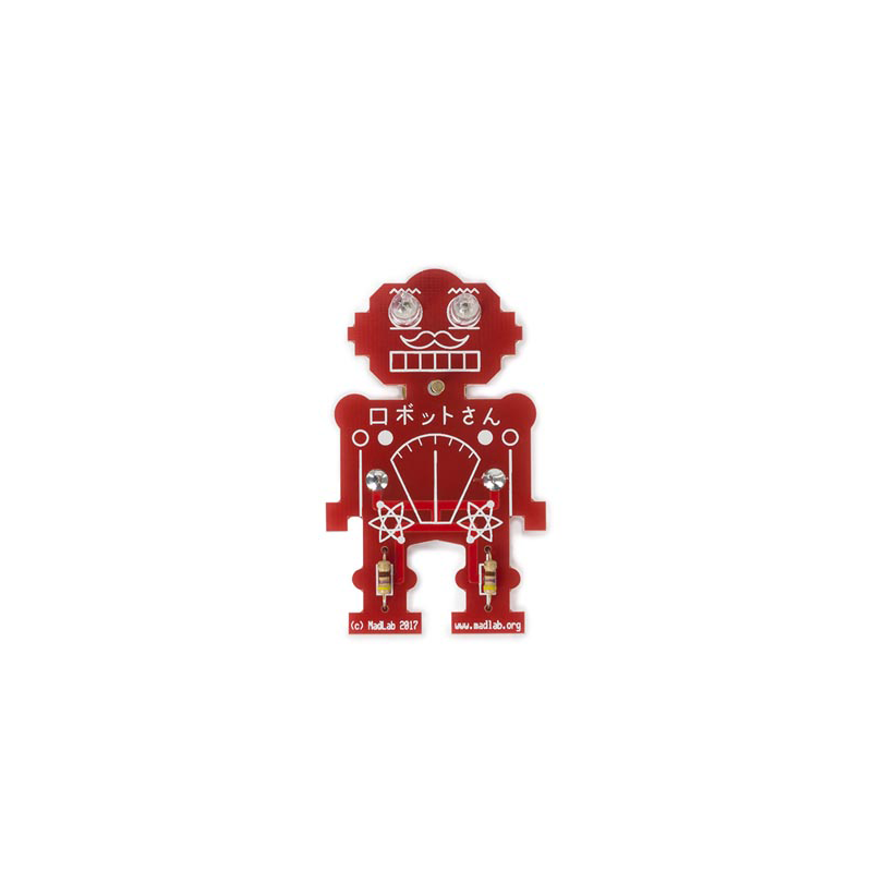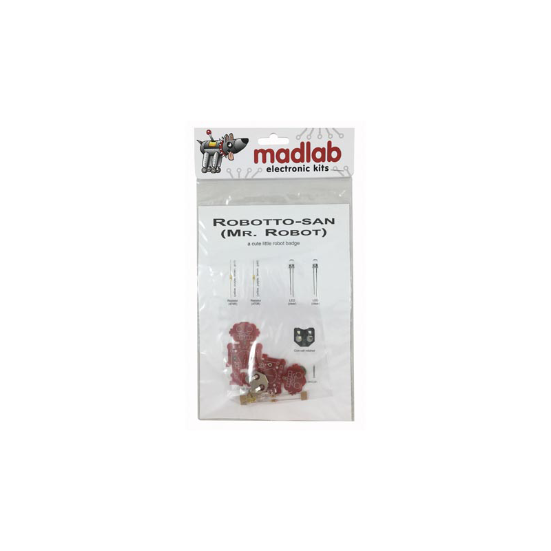 Mr. Robot (AKA Robotto-San) is a piece wearable electronics. He's a fun robot that you can choose to pin or clip to your clothes. With flashing LED eyes and a red PCB (printed circuit board), he's an electronic fashion statement with a touch of attitude.