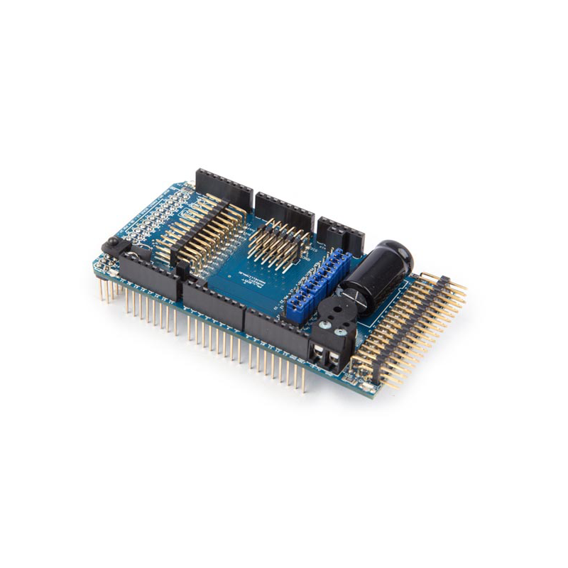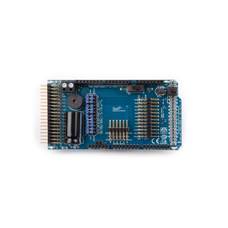 This SERVO SHIELD allows you to connect 12 9G SERVO motors when the shield is plugged into an Arduino® UNO or 36 9G SERVO motors when plugged into an Arduino MEGA. Aside from 9G SERVO motors you can connect sensors or other actuators as well. The SERVO SHIELD can also receive an IR signal from the ALLBOT IR MODULE and has a beeper that you can program to make all kind of noises. There are also 4 blue LEDs on each corner of the board that indicate when the board is powered. Do you have access to a 3D Printer? Then here's a cool project idea! Did you know that all the ALLBOT's plastic parts designs are available on Velleman Projects' Thingiverse account? This way, you can print your own parts and complete your ALLBOT with this SERVO - and BATTERY SHIELD! Features 36 in/outputs Arduino® Mega and Uno compatible IR receiver program or receive switch 6 analog ports (A0-A5) external power connector sounder 4 blue power indicating LEDs compatible with the ALLBOT BATTERY SHIELD and ALLBOT LI-ION BATTERY PACK spare part