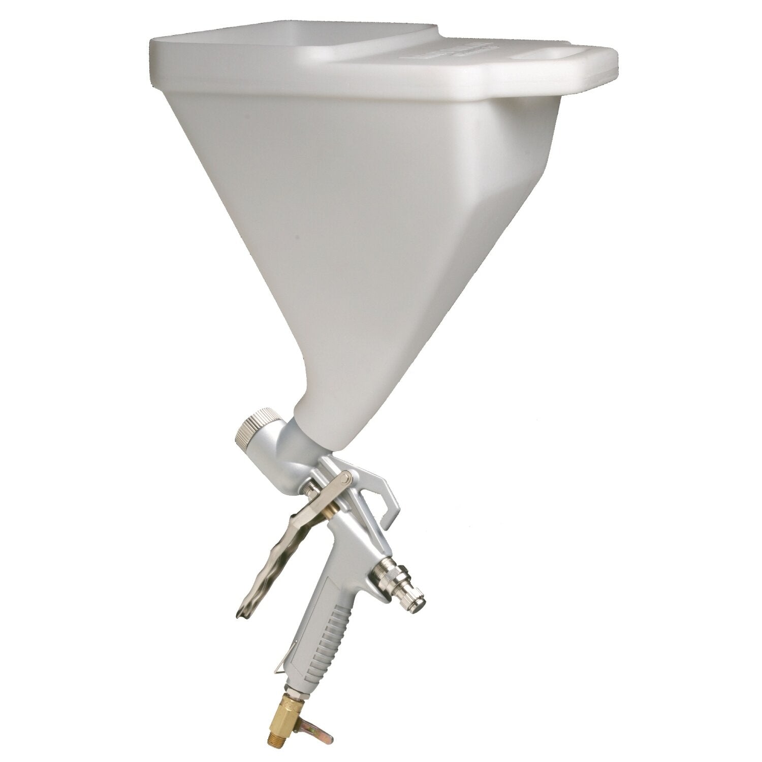 Sprays a variety of textures and materials. The large capacity hopper holds 2-1/2 gallons of material. The hopper's molded handle makes it easy to control while spraying. A built-in 40 degree angle allows user to easily direct spray in different directions, especially ceilings. The gun features a full grip trigger for ease, comfort, and less fatigue on long jobs. Remove the nozzle and tip for quick clean-up. The unique orifice adjusting nut makes changing the orifice quick and easy. Includes a 3/32 In. and a 1/8 In. air tip for more versatility. Patented Super-Pro® gun cylinder (U.S. Patent #5,415,351) has fewer individual parts for easy maintenance and clean up. Convenient shut-off valve for use with tank type compressors. Sprays a variety of textures and materials including walls, ceilings, fire proofing, stucco, decking, and waterproofing. We recommend testing your pattern on scrap material to determine the ideal settings. Use with a compressor that has 6.25 cfm at 20-25 psi for best results. Operations Manual and Parts List included.