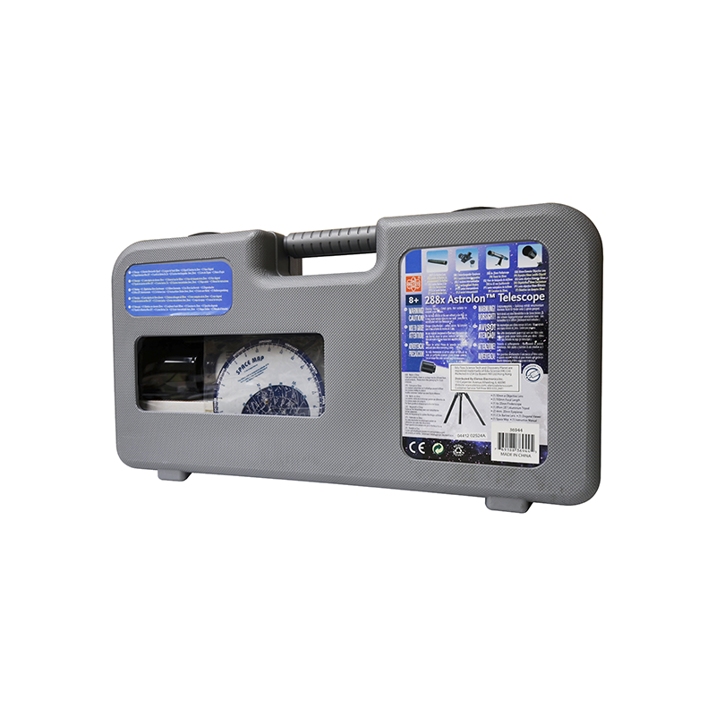 288x Astrolon Telescope with Aluminum Tripod 6 x 25mm Finderscope 2.3x Barlow lens 50mm Objective lens Diagonal viewer and two (2) interchangeable eyepieces Space map 36” Adjustable aluminum tripod Includes carrying case