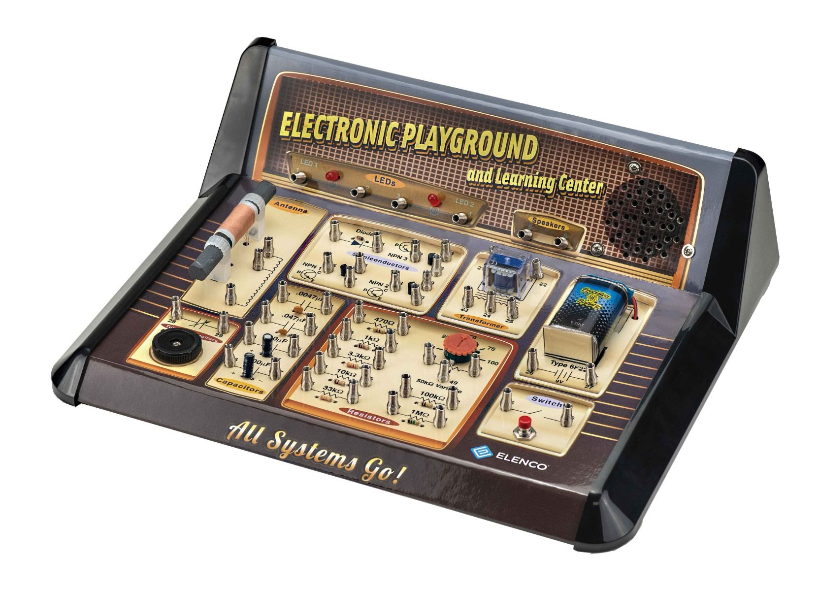 Build over 60 electronic projects including a finger touch lamp, a metal detector, a transistor radio, and an alarm with the 60-In-One Electronic Playground. Learn about voltage, currents, resistors, capacitors, and much more. Uses spring hook-up method.Features: