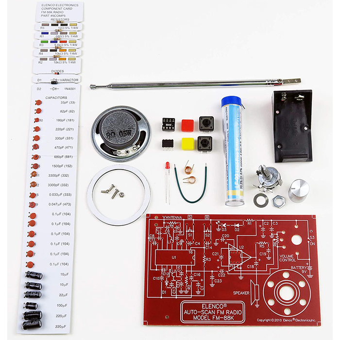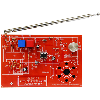 The ELENCO® FM-88K Kit is a monophonic, two-IC, FM (frequency modulation) receiver designed to receive FM signals in the frequency range (88-108MHz). It uses electronic auto-scan to search for FM stations. This scan system is done with two button switches - one switch scans up, the other resets to the start of the tuning position.