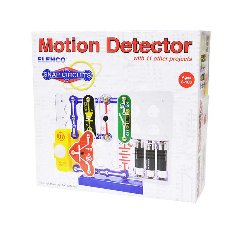 The Snap Circuits Motion Detector kit features 12 projects including silent or noisy motion detector and several other combinations of experiments that make use of light and sound.