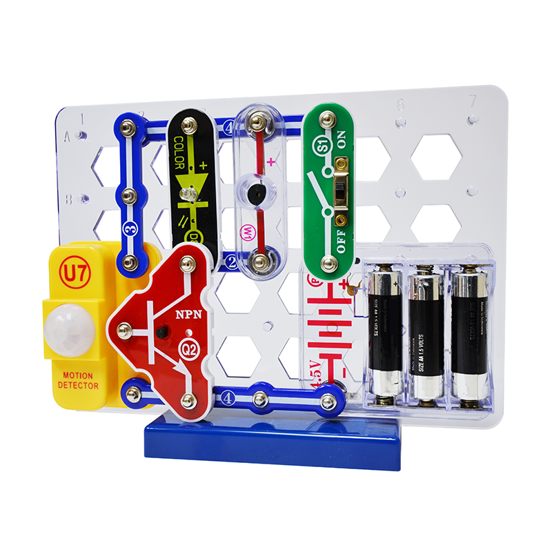 When motion is detected, a laser sound is emitted and the color LED flashes 11 additional projects. Elenco's Snap Circuits makes learning electronics easy and fun! Just follow the colorful pictures in our manual and build exciting projects such as AM radios, burglar alarms, doorbells and much more! You can even play electronic games with your friends. All parts are mounted on plastic modules and snap together with ease. Enjoy hours of educational fun while learning about electronics. No tools required. Uses "AA" batteries. Not included.