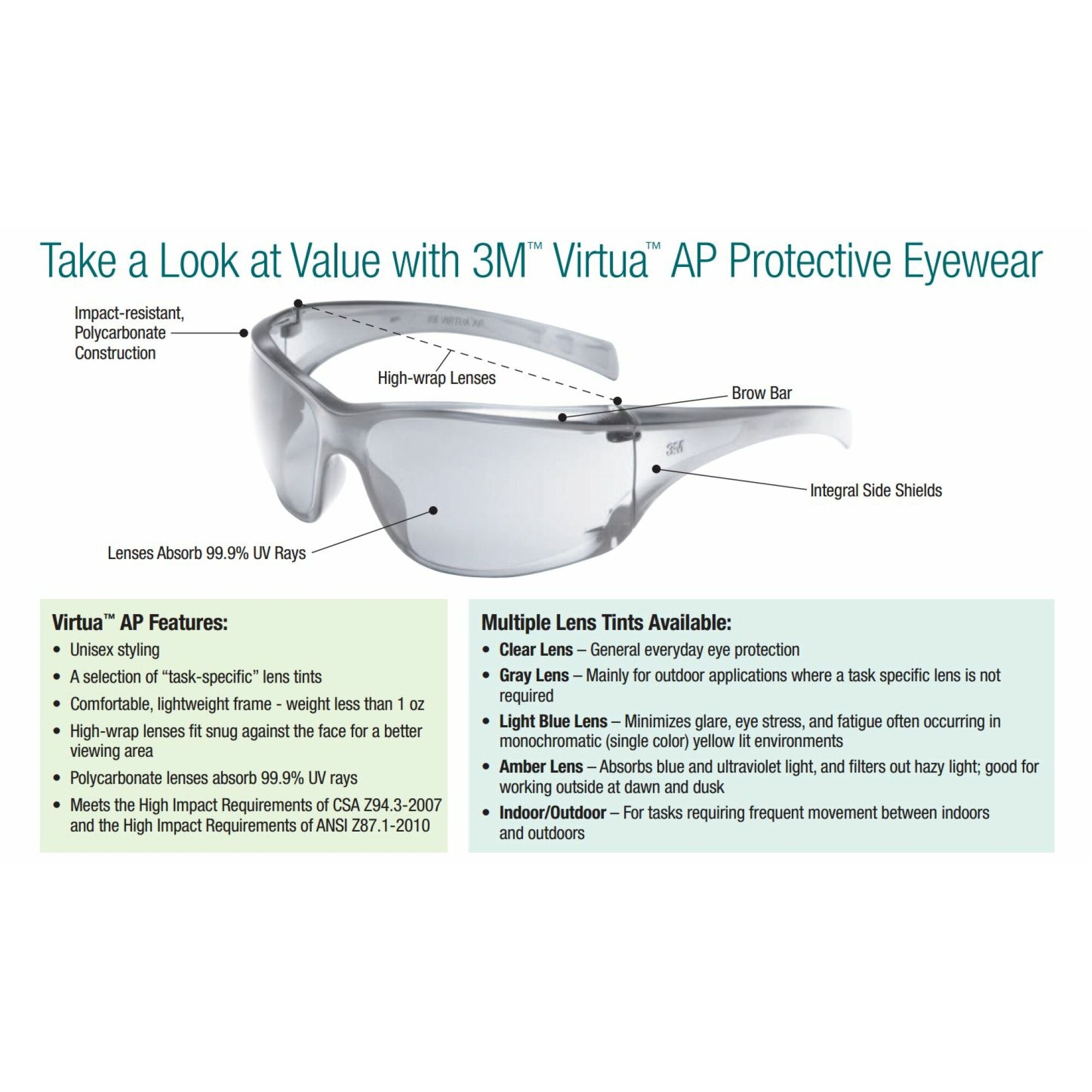 3M™ Virtua™ AP Protective Eyewear is an economy line of safety glasses that offer style, protection and affordability. Providing a wide viewing area, the wraparound design combines with the integrated side shields to help keep eyes protected.Integrated side-shieldsDesigned with high-wrap polycarbonate lenses and integral sideshields to provide comfort and protection.