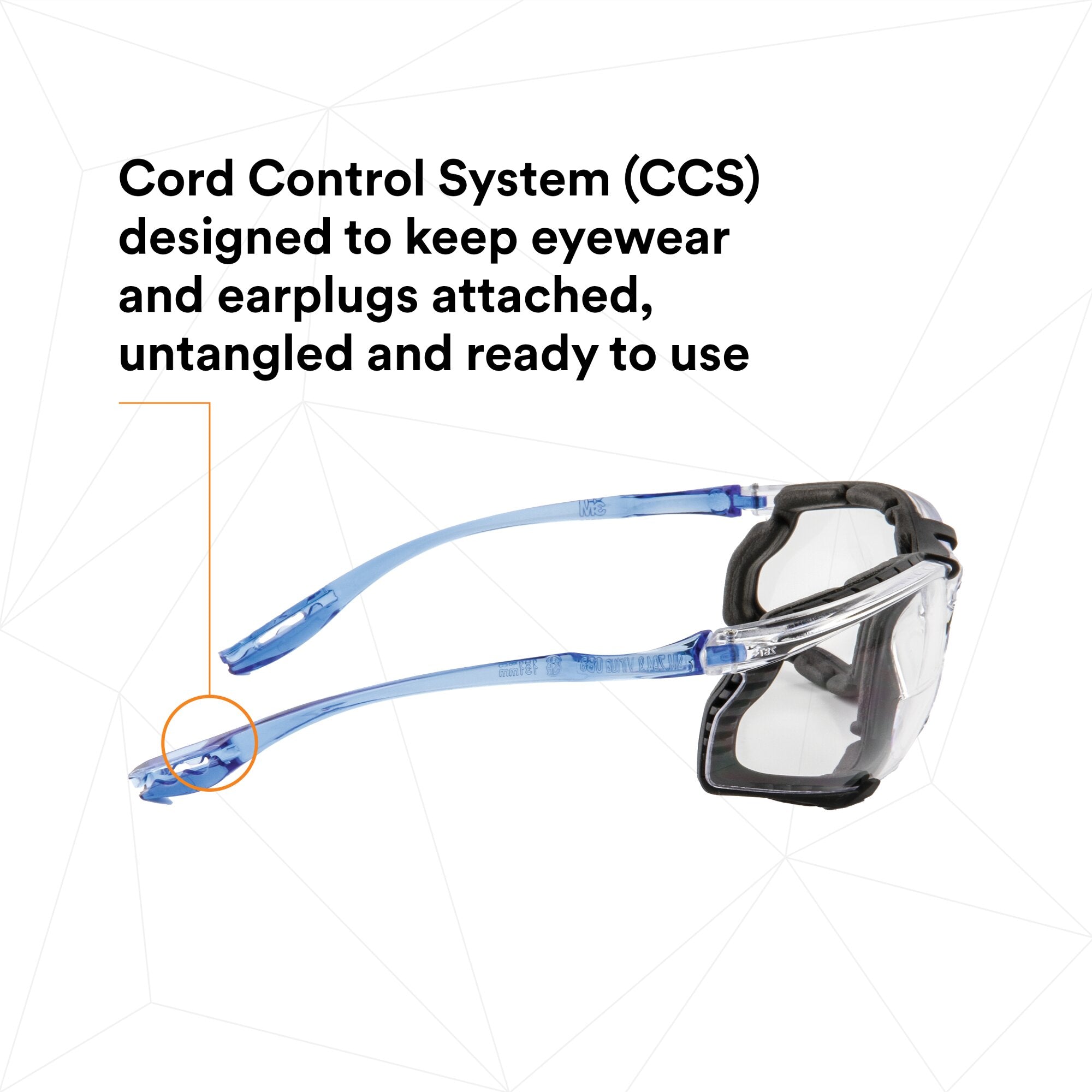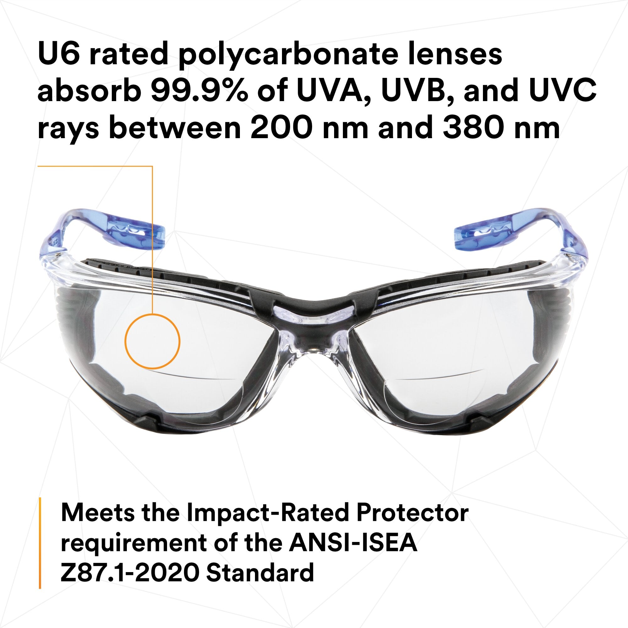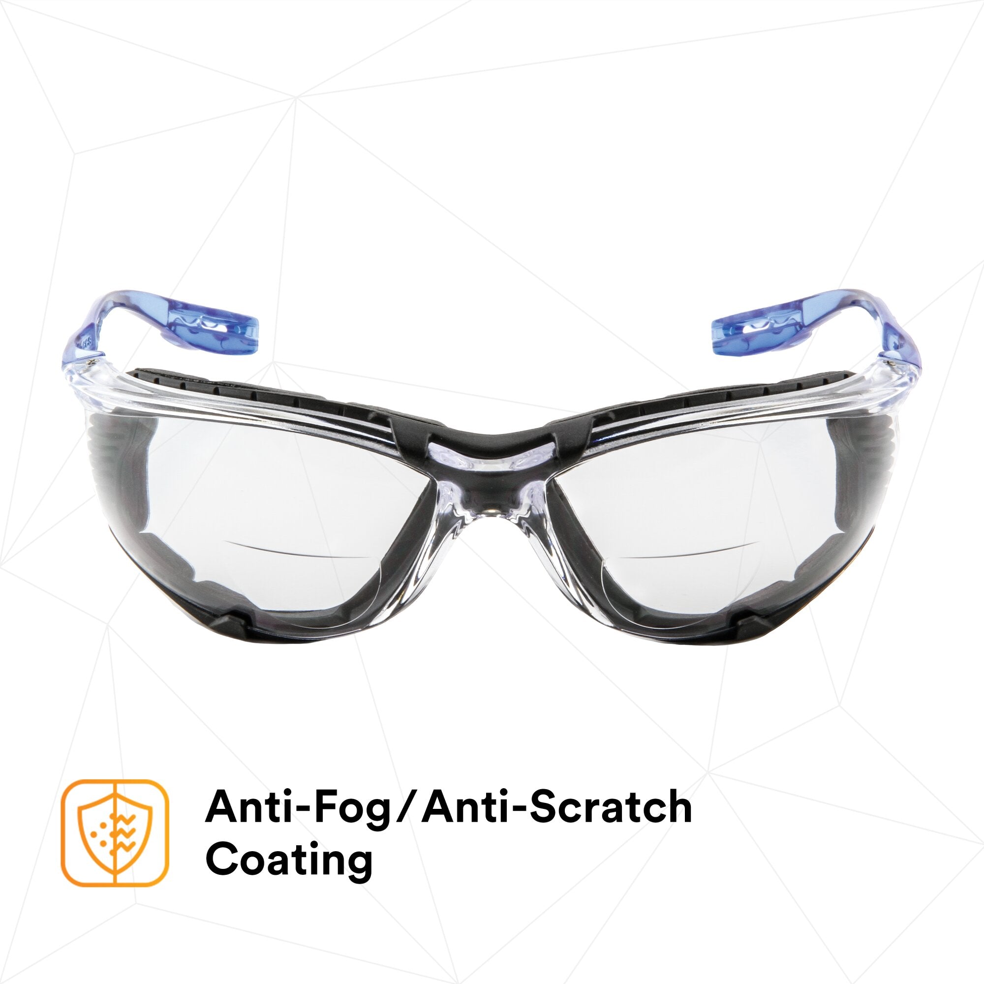 3M™ Virtua™ CCS Protective Eyewear lends an athletic-inspired image in a premium line of safety glasses that offers both protection and affordability. Clear anti-fog lens features a +2.5 reading diopter to help workers who have difficulty reading small print or who are engaged in small detail work. The optional foam gasket attachment helps limit eye exposure to nuisance dust while providing additional cushioning. The large wraparound lens keeps eyes more fully protected and provides a wide viewing area. Contoured temples fit comfortably and snugly without pressure points but also without any looseness that causes shifting. The impact-resistant polycarbonate lens absorbs 99.9% UV rays. Meets the requirements of CSA Z94.3 and ANSI Z87.1-2015.