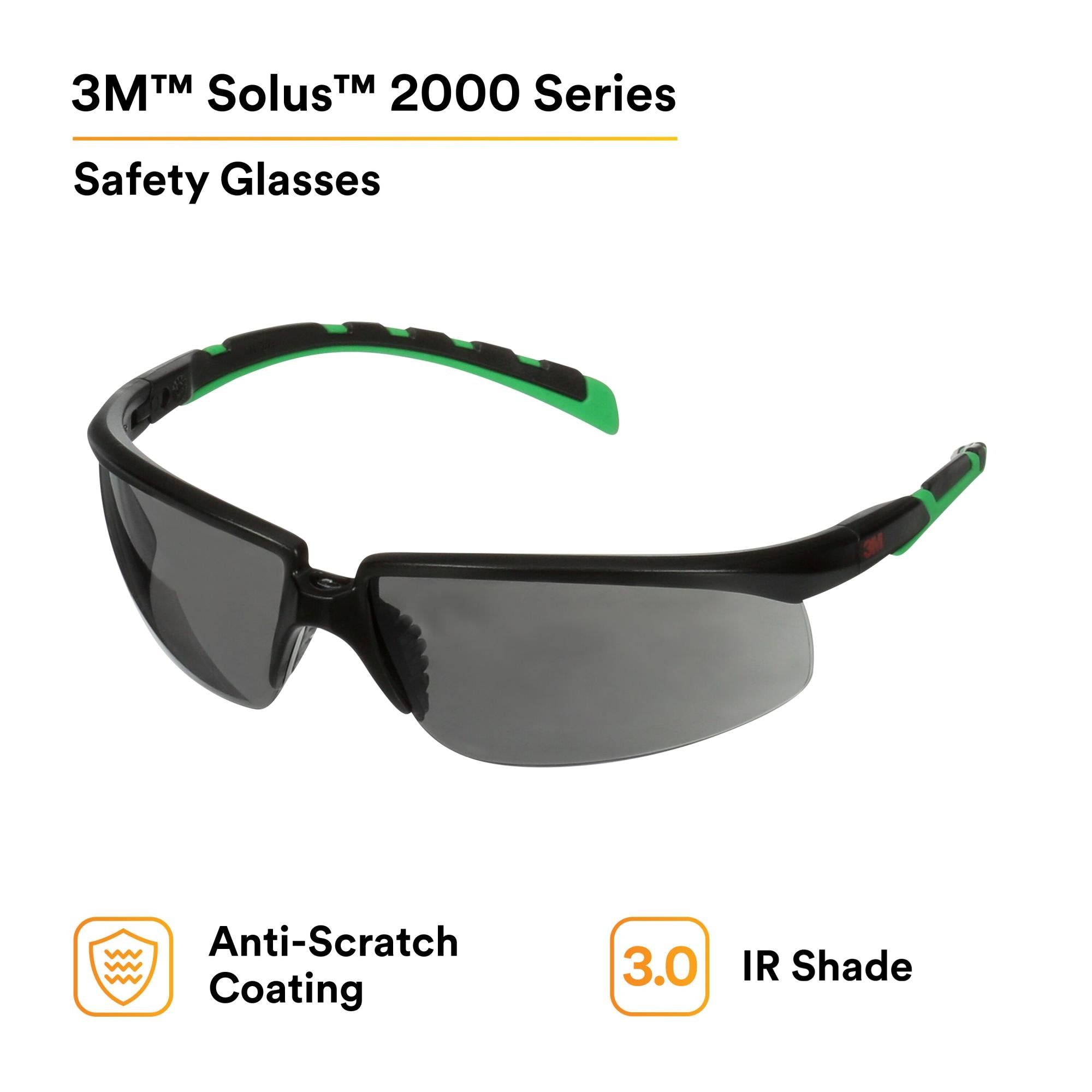 3M Solus 2000 Series Safety Glasses feature adjustable ratchet temples that allow wearers to customize fit -- a first for our Solus lineup. Choose from several lens coating options, including 3M Scotchguard Protector Anti-Fog, multiple lens tints and features like a removable foam gasket to create your best protective eyewear solution.
